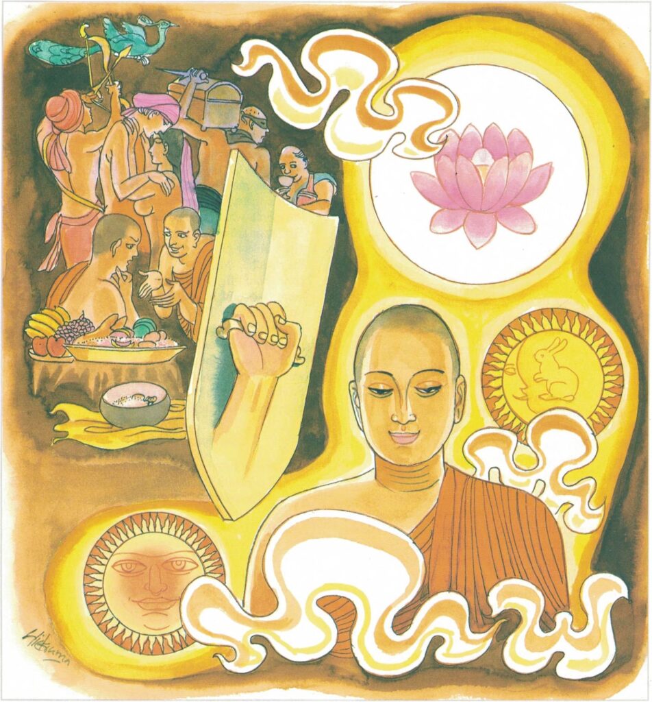 Now Tissa was in reality the son of a certain gatekeeper. While accompanying some carpenters on a journey through the country, he retired from the world on his arrival at Sāvatthi and became a monk. When the monks observed that he was thus finding fault with the gifts and other good works of men, they thought to themselves, “Let us find out the truth about him.” So they asked him, “Brother, where do your kinsfolk live?” “In such and such a village,” replied Tissa. The monks accordingly sent a few novices there to investigate. The novices went there and asked the villagers, who provided them with seats and food in the rest-house, “There is a novice named Tissa who came from this village and retired from the world; who are his kinsfolk?” Thought the villagers, “There is no youth who has left any gentleman’s household in this village and retired from the world; what are these novices saying?” So they said to the novices, “Venerables, we have heard of a certain gatekeeper’s son who travelled with a company of carpenters and retired from the world; without doubt he is the novice you refer to.” When the young monks learned that Tissa had no kinsfolk of consequence there, they returned to Sāvatthi and informed the monks what they had learned, saying, “Venerable, Tissa goes around chattering without sufficient cause.” The monks reported the matter to the Buddha. Said the Buddha, “Monks, this is not the first time he has gone about uttering words of disparagement and empty boasting; in a previous state of existence also he was a braggart.” The Buddha continued, “Monks, if any man is annoyed because others give either little or much, or coarse or fine food, or because they give nothing to him when he has given to others, such a man will not attain Trance or Insight or the Paths and the Fruits.” So saying, the Buddha preached the Dhamma by pronouncing these stanzas.