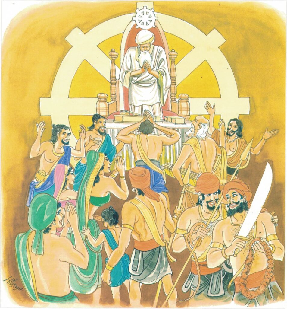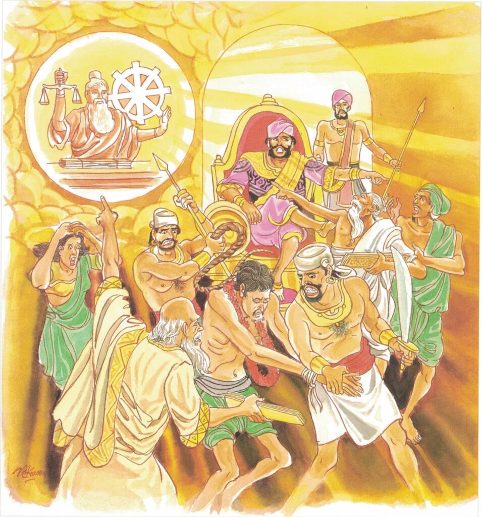 On a certain day the monks made their alms-round in a settlement at the north gate of Sāvatthi, and returning from their pilgrimage to the monastery, passed through the center of the city. At that moment, a cloud came up, and the rain began to fall. Entering a hall of justice opposite, they saw lords of justice taking bribes and depriving lawful owners of their property. Seeing this, they thought, “Ah, these men are unrighteous! Until now we supposed they rendered righteous judgments.” When the rain was over, they went to the monastery, saluted the Buddha, and sitting respectfully on one side, informed him of the incident. Said the Buddha, “Monks, they that yield to evil desires and decide a cause by violence, are not properly called justices; only they that penetrate within a wrong, and without violence render judgement according to the wrong committed, are properly called justices.”