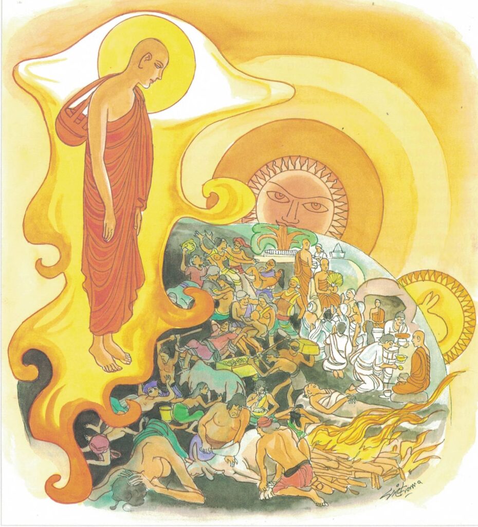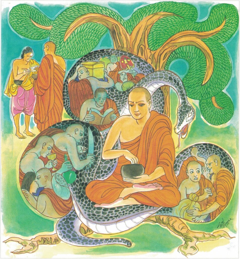 The story goes that this brāhmin retired from the world and became a monk of an heretical order. As he went about on his alms-round he thought to himself, “The Buddha addresses as monks his own disciples who go about on alms-round; he ought to address me also as a monk.” Accordingly, he approached the Buddha and said to him, “Venerable, I also support my life by going about on alms-round;address me as a monk.” But the Buddha said to him, “Brāhmin, I do not call a man a monk merely because he receives alms. For a man who adopts and practices all the forms is not therefore a monk. But he that weighs well all the aggregates of being and acts accordingly, he is a monk indeed.”