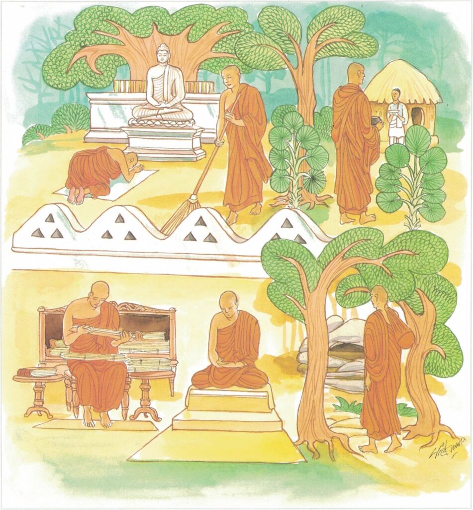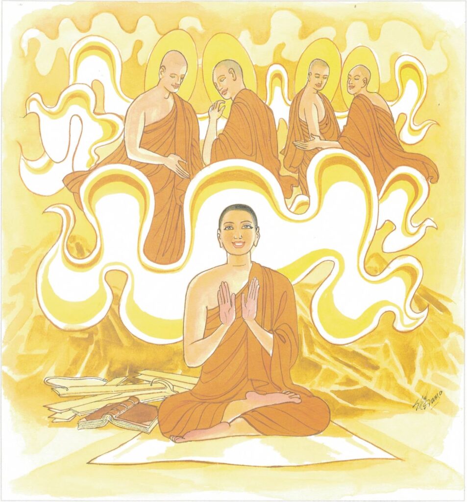 The story goes that some of these monks considered thus within themselves. “We have acquired virtue; we have taken upon ourselves the pure practices; we are exceedingly learned; we dwell in places of abode that are solitary and remote; we have developed the supernatural powers by ecstatic meditation. For us it would be no hard matter to attain arahatship; indeed, we could attain arahatship any day we wished.” Likewise those of the monks who had attained the fruit of the third path, considered thus within themselves, “For us it would be no hard matter now to attain arahatship.” One day all of them approached the Buddha, saluted him, and seated themselves respectfully to one side.