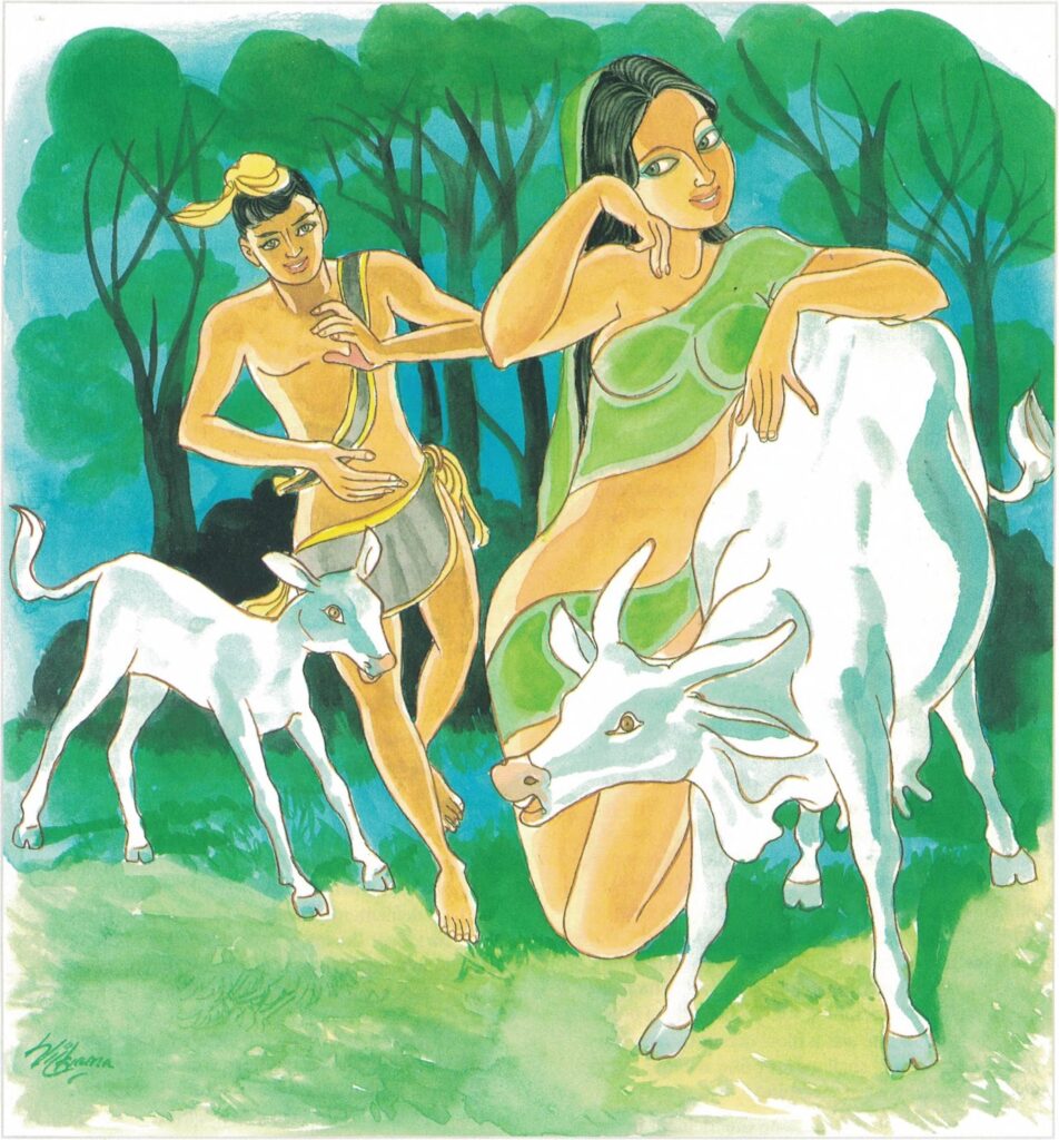 The monks fell to discussing the incident in the hall of truth. In came the Buddha and asked, “Monks, what are you discussing now, as you sit here all gathered together?” When they told him, he said, “Monks, this is not the first time they have so conducted themselves; the same thing happened in a previous state of existence also. In a previous state of existence they were all reborn as crows. As she was walking along the shore of the sea, a wave of the sea picked her up and flung her into the sea, and there she perished, whereupon they all wept and lamented. ‘We will pull her out again,’ said they, and forthwith set to work with their beaks to bale out the great ocean; finally were wearied of their task.”