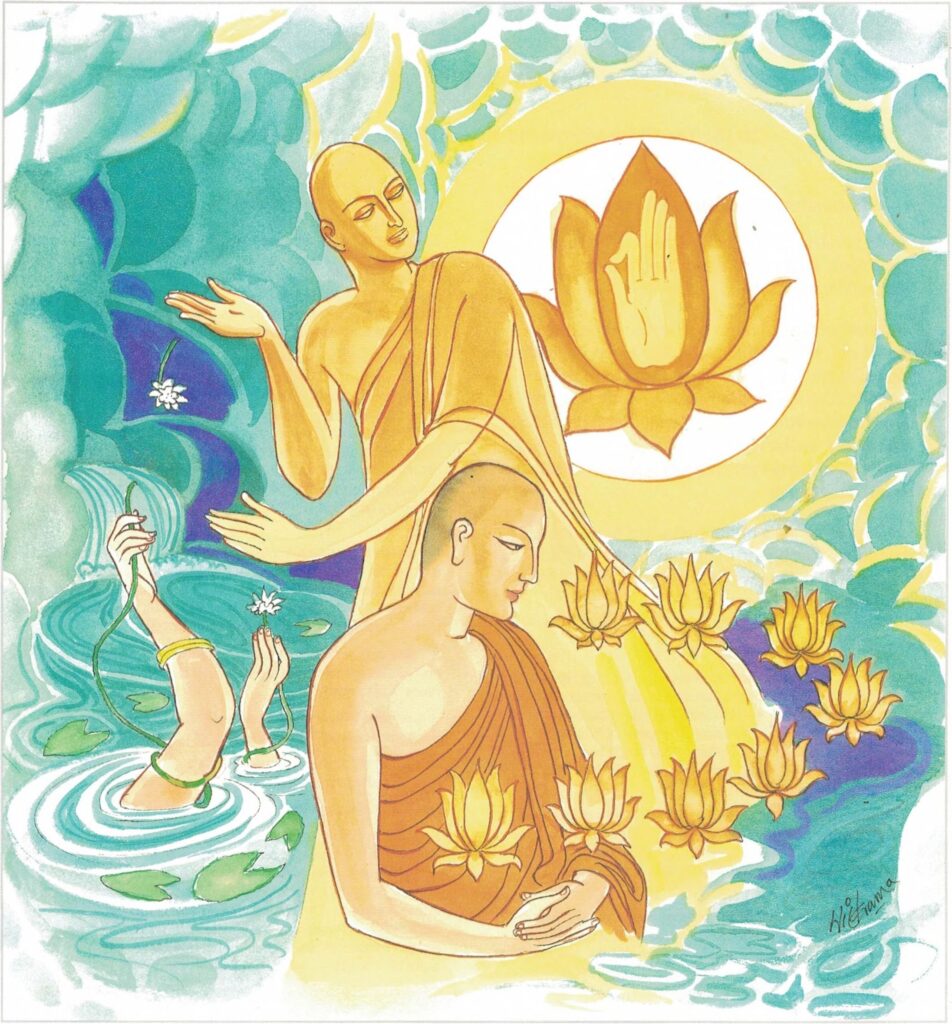 The Buddha knew that the young monk was the son of a goldsmith, and also that he had been born in the family of goldsmiths during his past five hundred existences. Therefore the Buddha changed the subject of meditation for the young monk; instead of loathsomeness, he was instructed to meditate on pleasantness. With his supernormal power, the Buddha created a beautiful lotus flower as big as a cart-wheel and told the young monk to stick it on the mound of sand just outside the monastery. The young monk, concentrating on the big, beautiful, fragrant lotus flower, was able to get rid of the hindrances. He was filled with delightful satisfaction (pīti), and step by step he progressed until he reached as far as the fourth level of mental absorption (jhāna).