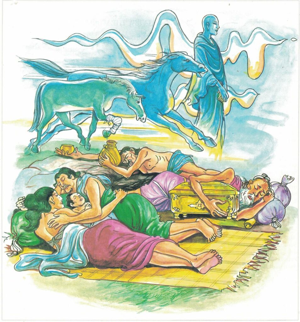 When the two monks had completed residence, they went to the Buddha, paid obeisance to him, and sat down respectfully on one side. The Buddha exchanged friendly greetings with them and queried, “I trust that you have lived the life of heedfulness and that you have devoted yourselves earnestly to the practice of meditation. I trust that you have reached the goal of the Religious Life.” The heedless monk replied, “Venerable, how can this monk be said to be heedful? From the time he left you he has done nothing but lie and sleep.” “But you, monk?” “I Venerable, early in the morning brought firewood and prepared the charcoal-dish, and during the first watch I sat and warmed myself, but I did not spend my time sleeping.” Then said the Buddha to the slothful monk, “You who have spent your time in heedlessness say, ‘I am heedful.’ You mistake heedlessness for heedfulness. Compared with my son, you are like a weak and slow horse; but he, compared with you, is like a fleet-footed horse.”