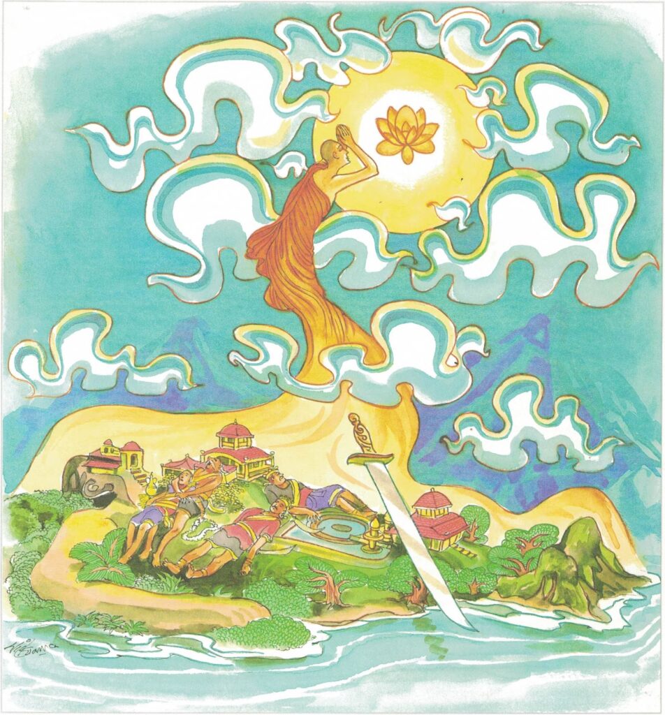 Pali text, illustration and English translation of Dhammapada verse 294-295: