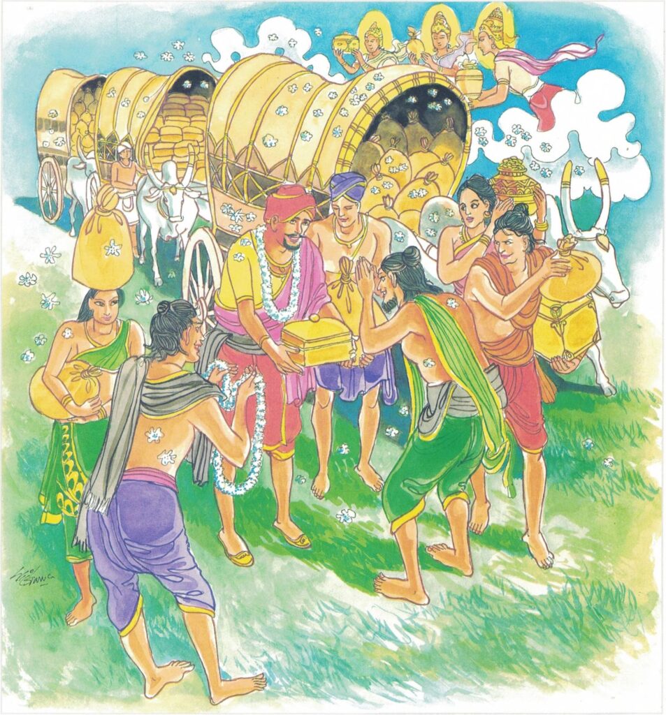 On the eve of his return journey, Citta put all the things he had brought with him in the rooms of the monastery as offerings to the Buddha. The devas then filled up the empty carts with various items of priceless things. The Venerable Ānanda, seeing how Citta’s riches were being replenished, asked the Buddha, “Venerable Sir! Is it only when Citta approached you that he is blessed with all these riches? Is he similarly blessed when he goes somewhere else?” To him the Buddha replied, “Ānanda, this disciple is fully endowed with faith and generosity; he is also virtuous and his reputation spreads far and wide. Such a one is sure to be revered and showered with riches wherever he goes.”
