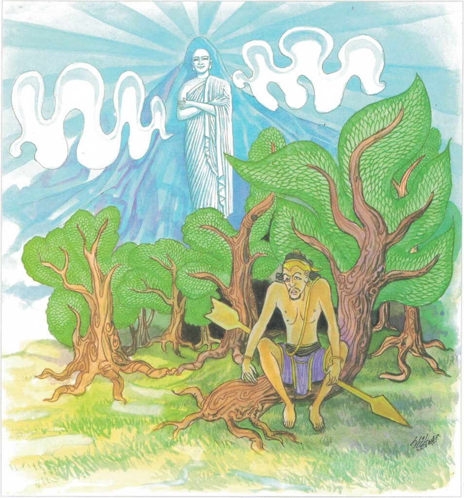 The mother-in-law of Cūlasubhaddā was very anxious to see the Buddha when she was told about him by her daughter-in-law. She even agreed to let Cūlasubhaddā invite the Buddha for alms-food to their house. So, Cūlasubhaddā prepared food and collected other offerings for the Buddha and his disciples. She then went up to the upper part of the house and looking towards the Jetavana Monastery, she made offerings of flowers and incense and contemplated the unique qualities and virtues of the Buddha. She then spoke out her wish, ‘Venerable! May it please you to come, with your disciples, to our house tomorrow. I, your devoted lay-disciple, most respectfully invite you. May this invitation of mine be made known to you by this symbol and gesture.” Then she took eight fistfuls of jasmin and threw them up into the sky. The flowers floated through the air all the way to the Jetavana Monastery and lay hanging from the ceiling of the congregation hall where the Buddha was expounding the Dhamma.