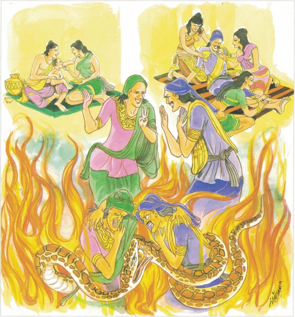 Sundarī understood what was expected of her. Thus, late in the evening, she went in the direction of the Jetavana Monastery. When she was asked where she was going, she answered, “I am going to visit Samana Gotama; I live with him in the perfumed chamber of the Jetavana Monastery.” After saying this, she proceeded to the place of the non-Buddhist ascetics. Early in the morning the next day, she returned home. If anyone asked her from where she had come she would reply, “I have come from the perfumed chamber after staying the night with Samana Gotama.” She carried on like this for two more days. At the end of three days, those ascetics hired some drunkards to kill Sundarī and put her body in a rubbish heap near the Jetavana Monastery.