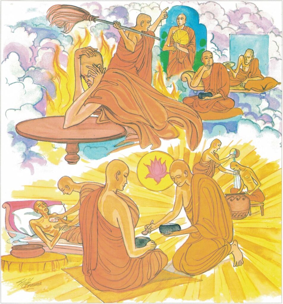 Once, a woman with a very strong sense of jealousy lived with her husband in Sāvatthi. She found that her husband was having an affair with her maid. So one day, she tied up the girl with strong ropes, cut off her ears and nose, and shut her up in a room. After doing that, she asked her husband to accompany her to the Jetavana Monastery. Soon after they left, some relatives of the maid arrived at their house and found the maid tied up and locked up in a room. They broke into the room, untied her and took her to the monastery. They arrived at the monastery while the Buddha was expounding the Dhamma. The girl related to the Buddha what her mistress had done to her, how she had been beaten, and how her nose and ears had been cut off. She stood in the midst of the crowd for all to see how she had been mistreated.