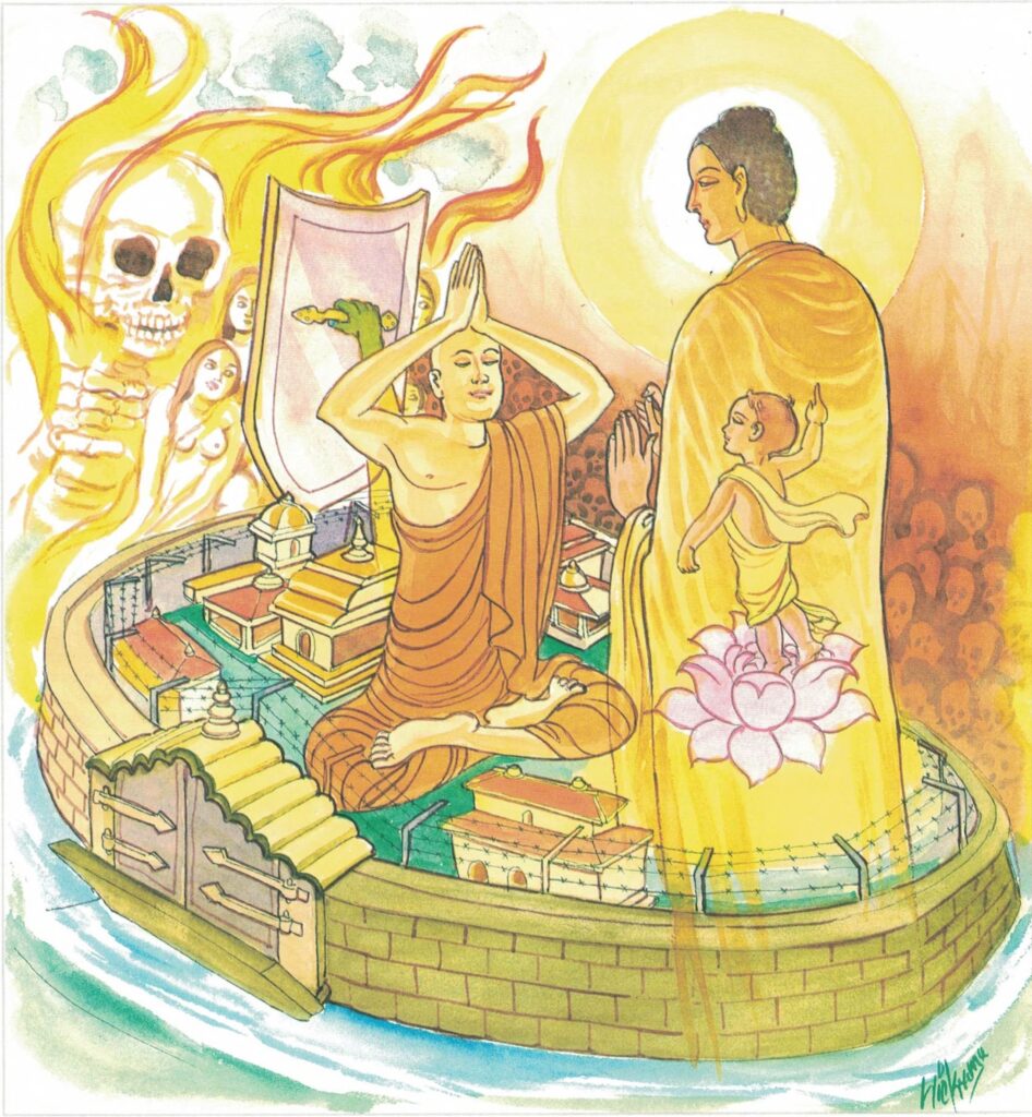 In this verse the Buddha’s advice is to guard one’s mind just as rulers would guard a border town. The guarding of the mind comes within the field of mind concentration–bhāvanā–meditation, the central purpose of which is perpetual alertness of mind.