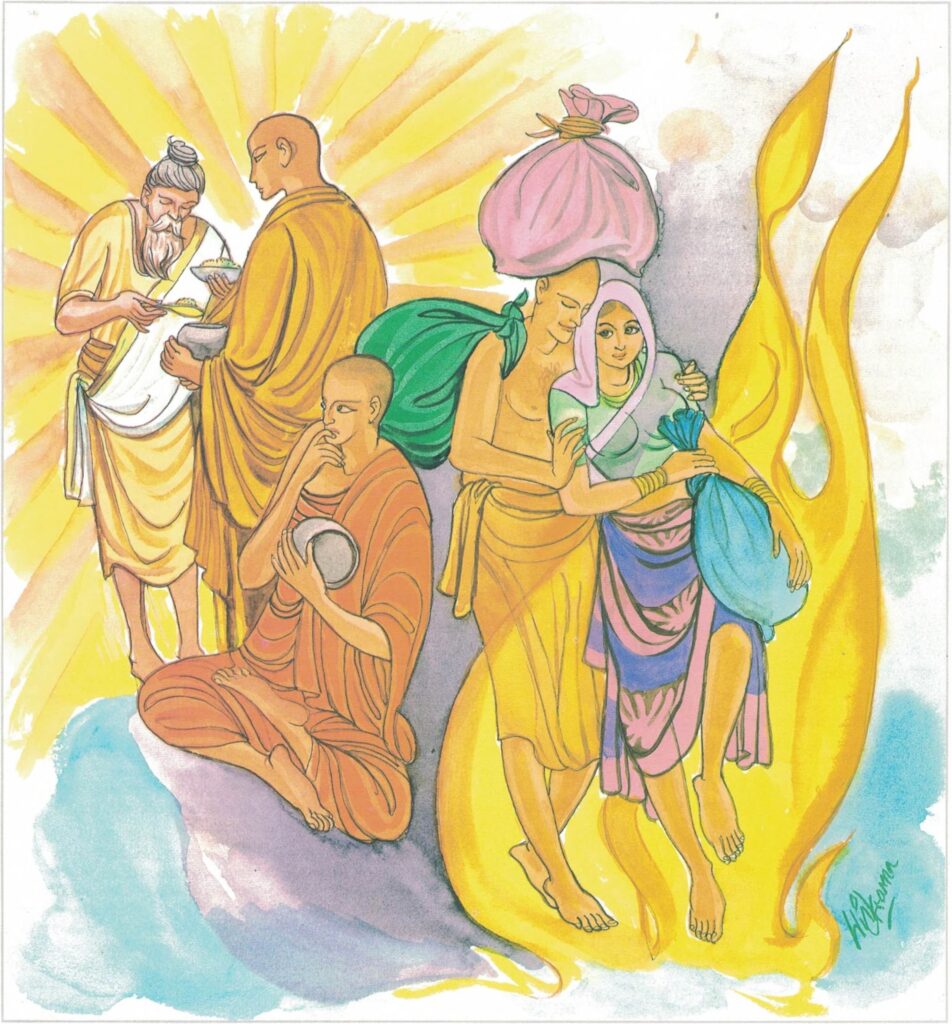 One day, some Nigaṇṭhas went on an alms-round with their bowls covered with a piece of cloth. Some monks, seeing them, commented, “These Nigaṇṭha ascetics who cover the front part of the body are more respectable compared to those Acelaka ascetics who go about without wearing anything.” Hearing this comment, those ascetics retorted, “Yes, indeed, we do cover up our front part (by covering our bowls); but we cover it up not out of shame in going naked. We only cover up our bowls to keep away dust from our food, for even dust contains life.”