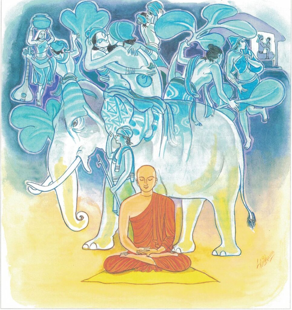 When told about Sāmanera Sānu, the Buddha wishing to teach him about the restraint of mind said, “My son, one who does not restrain the mind which wanders about cannot find happiness. So, control your mind as a mahout controls an elephant.”