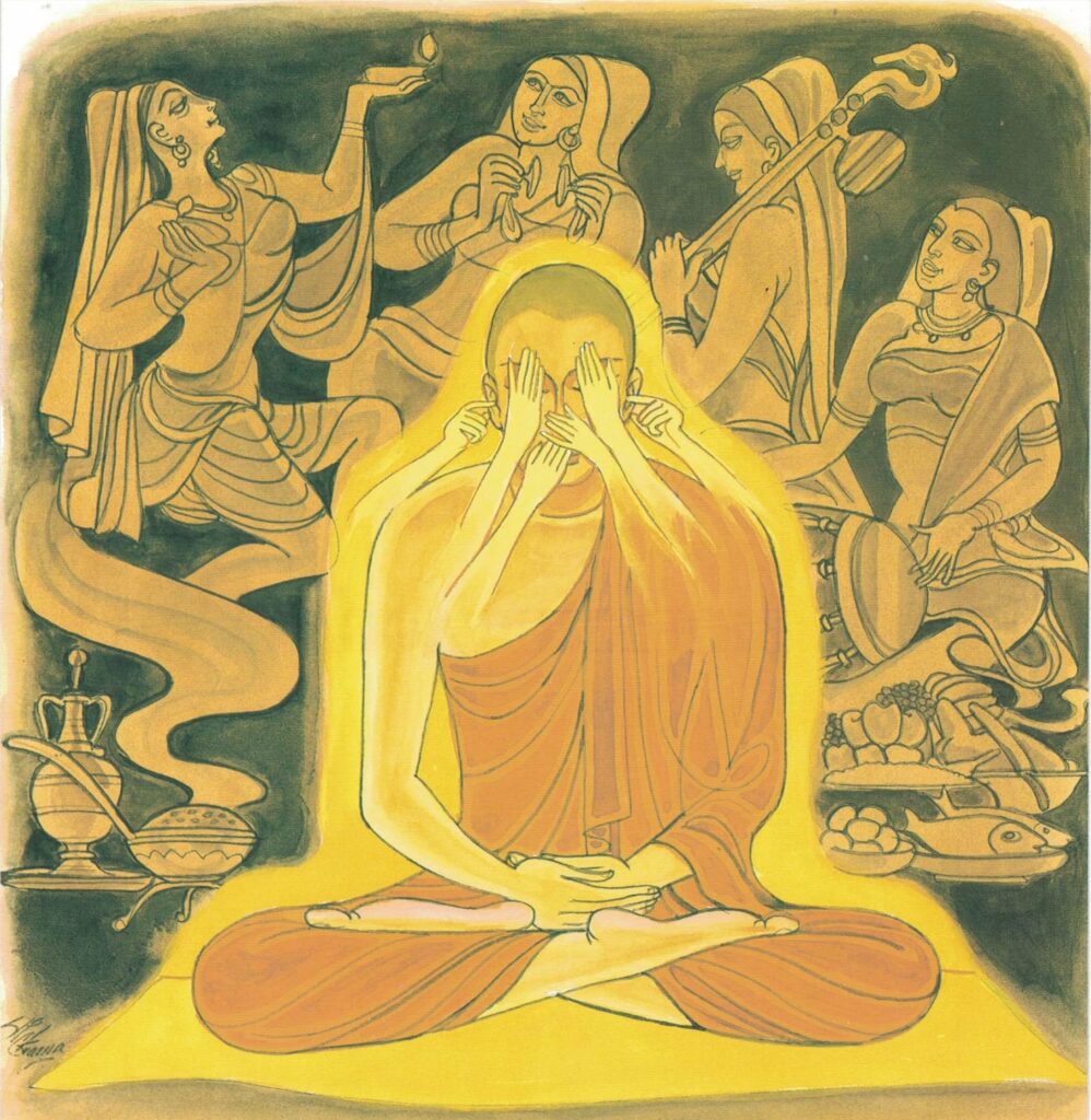 The Buddha carefully avoided placing any one of the monks in a position inferior to that of his fellows and said in reply, “Monks, all of these doors are difficult to guard. But this is not the first time you have failed to control yourselves in these five particulars. In a previous state of existence also you failed to exercise restraint over your senses, and because you failed to exercise restraint over your senses, and because you refused to comply with the admonition of wise men, met destruction.” “When was that, Venerable?” asked the five monks.