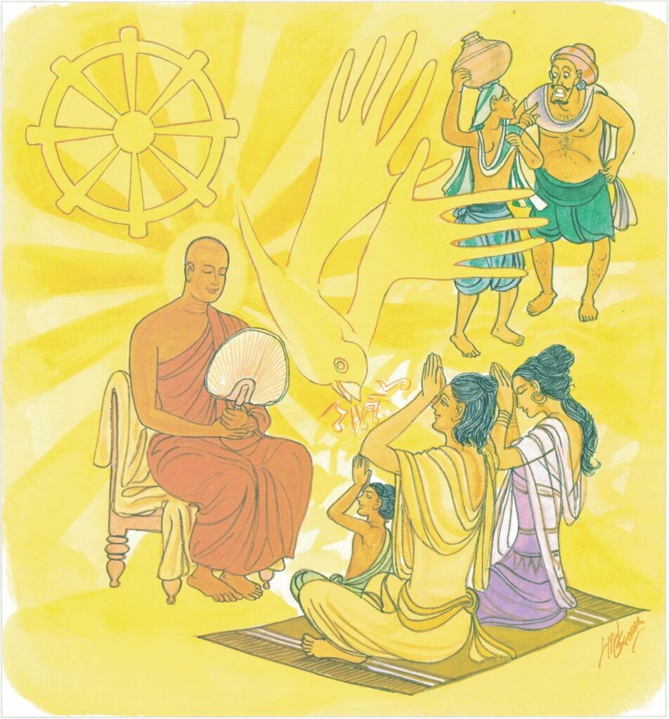 Some village boys, seeing a tortoise carried along in this fashion by geese, immediately cried out, “See those two geese carrying a tortoise on a stick!” Thought the tortoise, “You vagabonds, what business is it of yours if my friends are carrying me with them?” And he opened his mouth, intending to say what was in his mind. Now the geese were flying very swiftly, and by this time they had reached a point directly over the royal palace in Vārāṇasi city. So when the tortoise let go of the stick, he fell to the ground right in the middle of the palace court, and the moment he struck the ground, split into two pieces.