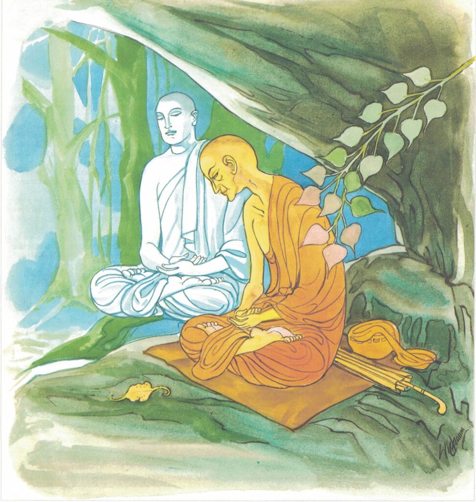 At that instant, the brāhmin turned round and saw the Buddha. At once he knew what his wife had done, and cried out, ‘Wife, I am ruined. When our Venerable Teacher stood at the door you should have informed me. By failing to do so you have embarrassed me greatly.” Then, taking up his plate of rice, he approached the Buddha and apologetically requested, “Venerable! Please accept this rice which I have partly consumed. I am very sorry indeed that I have to offer you partly consumed food.” To him the Buddha replied, “O brāhmin! Any alms-food is suitable for me, whether it has been eaten or not.” The brāhmin was very happy because his offering of food was accepted by the Buddha and he next asked by what standard a monk was judged and how a monk was defined. The Buddha knew that both the brāhmin and his wife had already learned something about mind and body (nāma-rūpa), so he answered, “O brāhmin! One who is not attached to mind and body is called a monk.” At the conclusion of the discourse, both the brāhmin and his wife attained the third stage of sainthood.