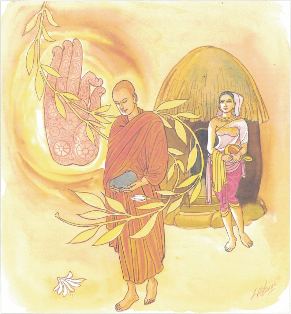 A group of monks from Sāvatthi, after taking a meditation topic from the Buddha, set out for the forest to practice meditation. While thus engaged, they saw jasmine flowers which had blossomed that very morning, dropping in the evening from the stem. Thereupon they thought to themselves, “We will obtain release from lust, hatred, and delusion, before you obtain release from your stems,” and applied themselves to meditation with renewed vigor. The Buddha behold those monks and said, “Monks, even as a flower is released from its stem, even so should a monk strive to obtain release from the pain of birth and rebirth.” And even as he sat within the perfumed chamber, he sent forth a light and pronounced the following stanza,