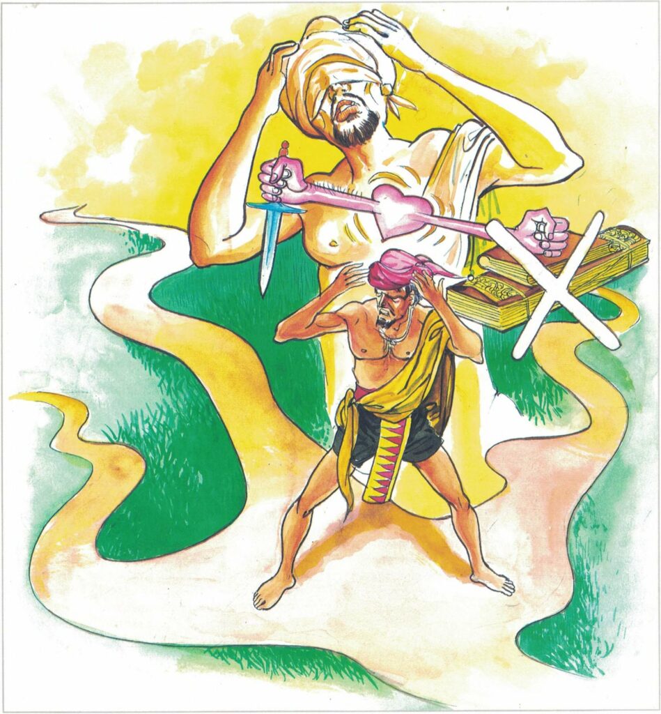 As Cittahattha proceeded on his way, repeating the words, “All that is in this world is transitory, is involved in suffering,” he obtained the fruit of conversion (sotāpatti phala). Continuing his journey, he went to the monks, bowed to them, and asked to be received into the Sangha. “No,” said the monks, “we cannot receive you into the Sangha. Why should you become a monk? Your head is like a grindstone.” “Venerable, receive me into the Sangha just this once.” Because he had helped them, they received him into the Sangha. After a few days he attained arahatship, together with the supernatural faculties.