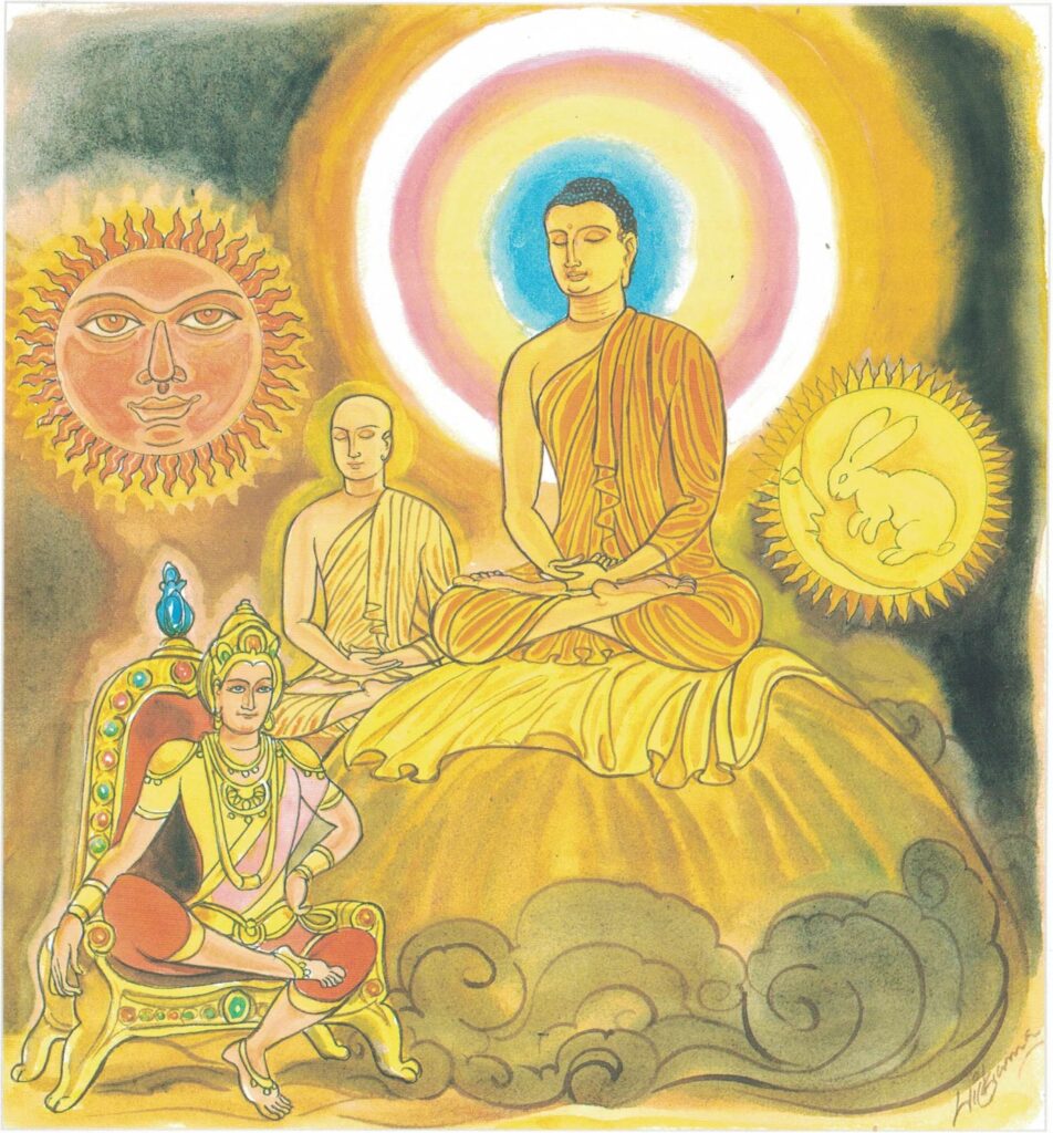 The story goes that on the Great Terminal Festival, Pasenadi Kosala went to the monastery adorned with all the adornments, bearing perfumes, garlands and the like in his hands. At that moment Venerable Kāludāyi was sitting in the outer circle of the congregation, having entered into a state of trance. His body was pleasing to look upon, for it was of a golden hue. Now just at that moment the moon rose and the sun set. Venerable Ānanda looked at the radiance of the sun as the sun set, and of the moon as the moon rose; then he looked at the radiance of the body of the king and at the radiance of the body of the Venerable and at the radiance of the body of the Tathāgata. The Buddha far outshone the radiance of all the others.