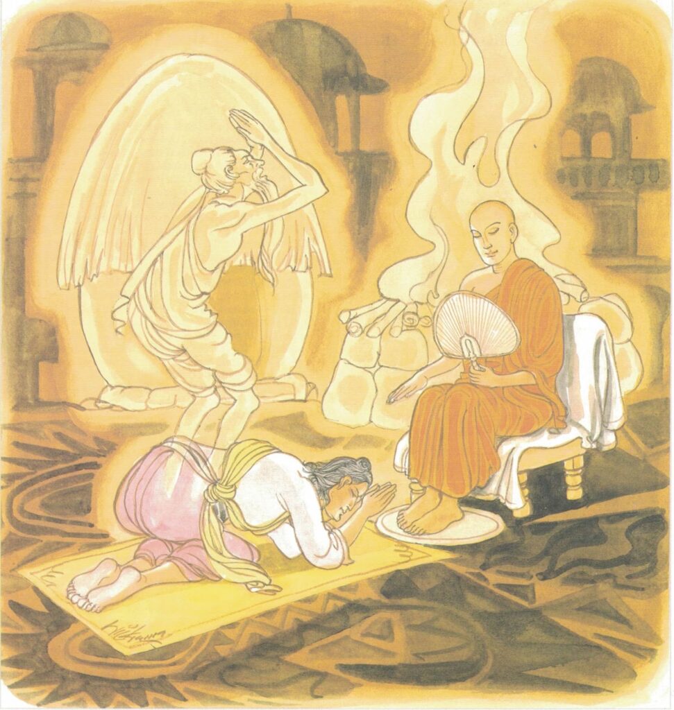 The Buddha caused the elder to be summoned before him and asked him, “Sāriputta, is the report true that you are going about doing reverence to the cardinal points?” “Venerable, you know me, and you know of yourself whether or not I am going about doing reverence to the cardinal points.” Then said the Buddha, “Monks, Sāriputta is not doing reverence to the cardinal points. The fact is that he first heard the Dhamma from the lips of Venerable Assajī, and that from the day when he attained the fruit of conversion, he has reverenced his own teacher. For a monk should reverence the teacher through whom he has learned the Dhamma with the same degree of reverence with which a brāhmin reverences the sacred fire.”