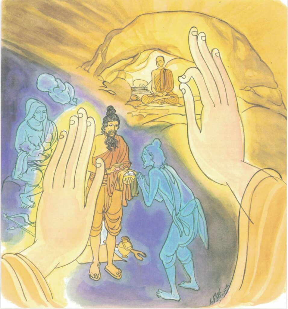 The story goes that a certain Brāhman one day said to himself, “The monk Gotama calls his own disciples ‘Brāhmans.’ Now I was reborn in the womb of a Brāhman mother; therefore he ought to apply this title to me too.” So he approached the Buddha and asked him about the matter. Said the Buddha to the Brāhman, “I do not call a man a Brāhman merely because he received a new existence in the womb of a Brāhman mother. But he that is without worldly possessions, he that grasps not after the things of this world, him alone I call a Brāhman.”