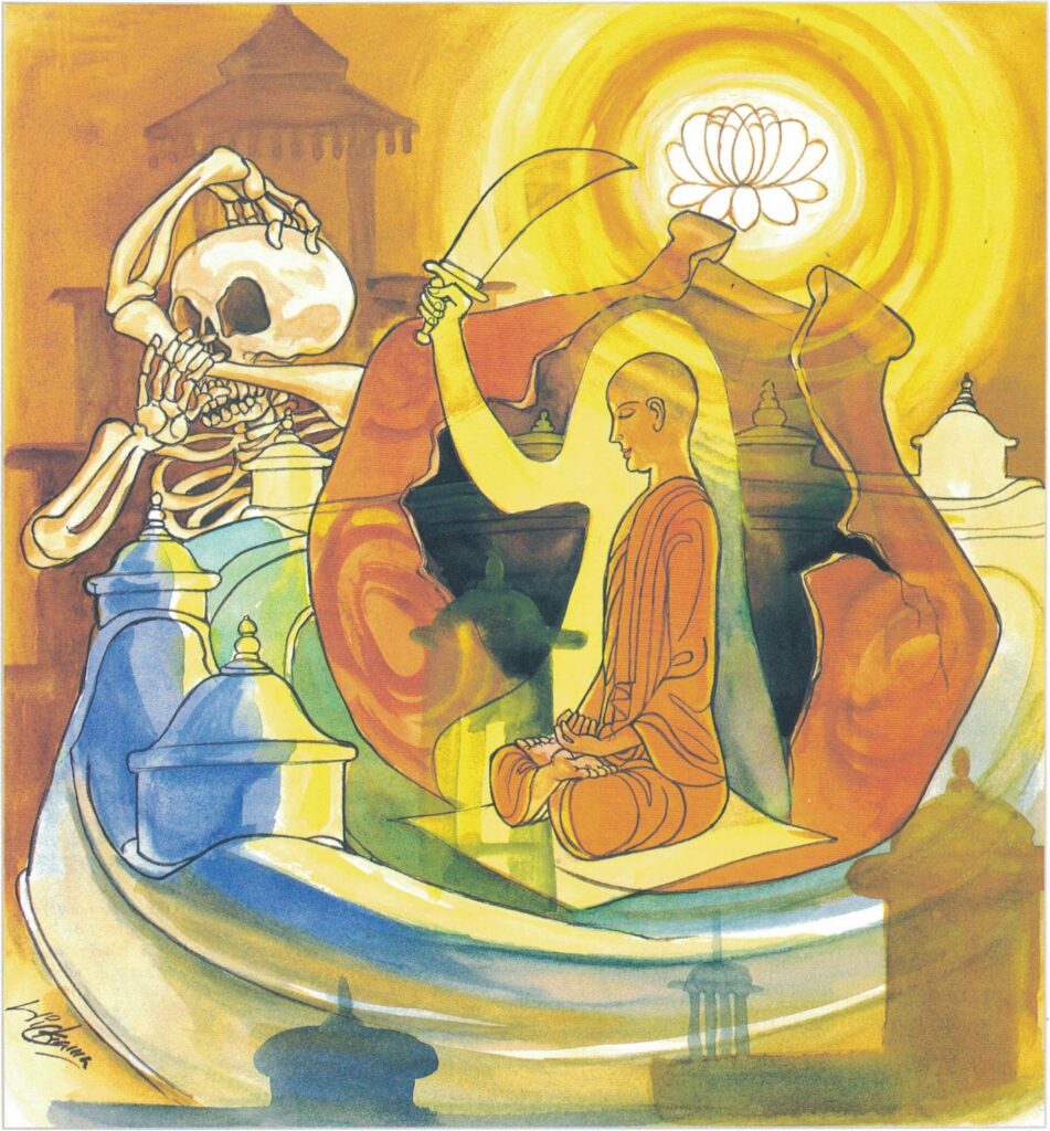 yodhetha Māraṃ paññāyudhena: oppose Māra (evil) with the weapon of wisdom. When forces of evil attack the mind–the city to be guarded–the only weapon for a counter offensive is wisdom, which is a perfect awareness of the nature of things in the real sense.