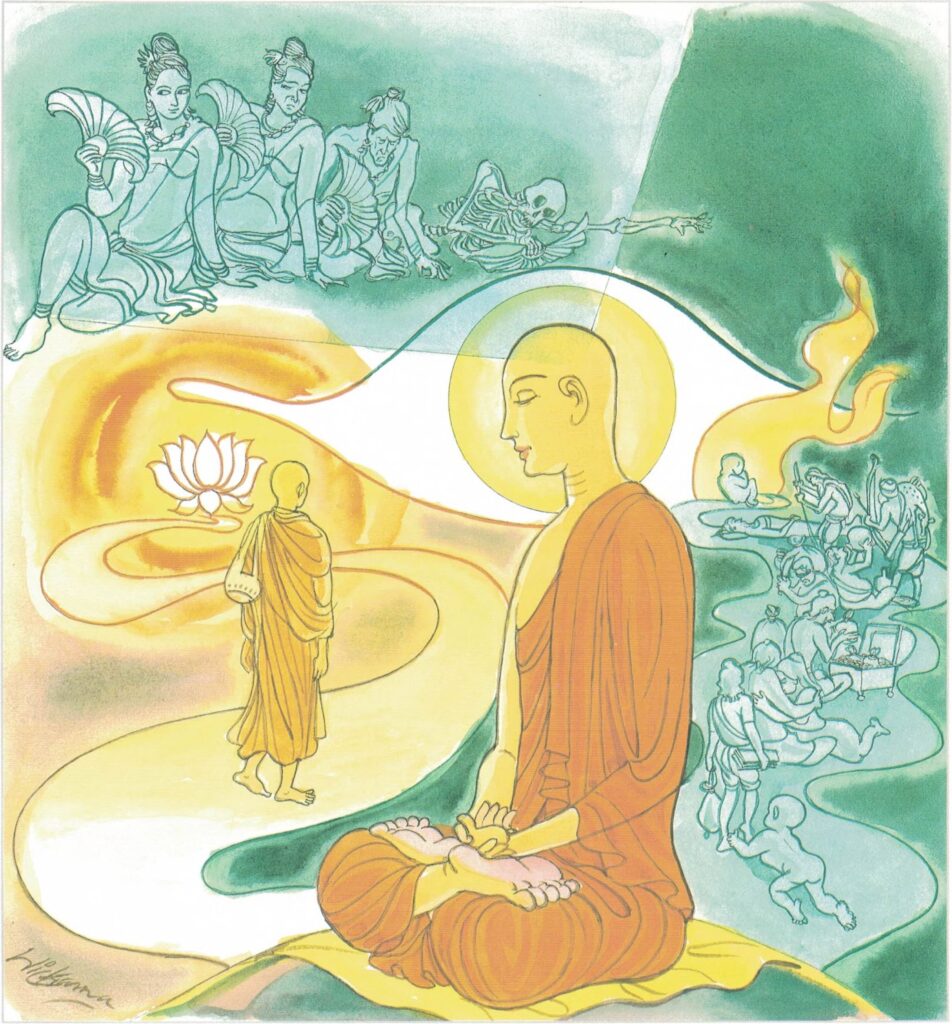 Every time she visited the temple she dodged the Buddha. One day the king got his men to take her willy-nilly to the Buddha. On her arrival, the Buddha created a phantom of unsurpassing beauty to attend on Him. Khemā was struck by her beauty. While she was thus engaged she felt that beauty could only beguile. The Buddha made the figure to go through youth middle age, old age and thereafter to extreme old age devoid of everything worthwhile. Beauty thus gave way to hideousness. It was a graphic picture. Khemā understood the meaning and felt what was in store for her. Anicca, dukkha and anatta: in other words, transiency and sorrow–without any lasting entity called a soul.