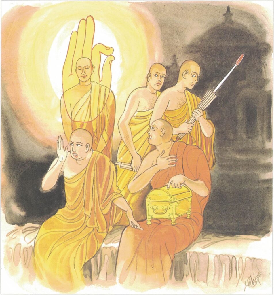The story goes that the wife of a certain brāhmin prepared food for four specially designated monks, and said to the brāhmin her husband, “Go to the monastery, pick out four old brāhmins, and bring them here.” The brāhmin went to the monastery and brought four seven-year-old novices who had attained arahatship, Saṃkicca, Paṇḍita, Sopāka, and Revata. The brāhmin’s wife had expensive seats prepared and stood waiting. At sight of the novices, she was filled with rage, and sputtering as when salt is dropped on a brazier, she said to her husband, “You have gone to the monastery and brought back with you four youngsters not old enough to be your grandsons.” She refused to let them sit on the seats which she had prepared, but spreading some low seats for them, said to them, “Sit here!” Then she said to her husband, “Brāhman, go look out some old brāhmins and bring them here.” The brāhmin went to the monastery, and seeing Venerable Sāriputta, took him back home with him. When the Venerable reached the house and saw the novices, he asked, “Have these brāhmins received food?” “No, they have received no food.” Knowing that food had been prepared for just four persons, he said, “Bring me my bowl,” and taking his bowl, departed. Said the brāhmin’s wife, “It must be that he did not wish to eat; go quickly, look out another brāhmin and bring him here.” The brāhmin went back to the monastery and brought Venerable Mahā Moggallāna back home with him.