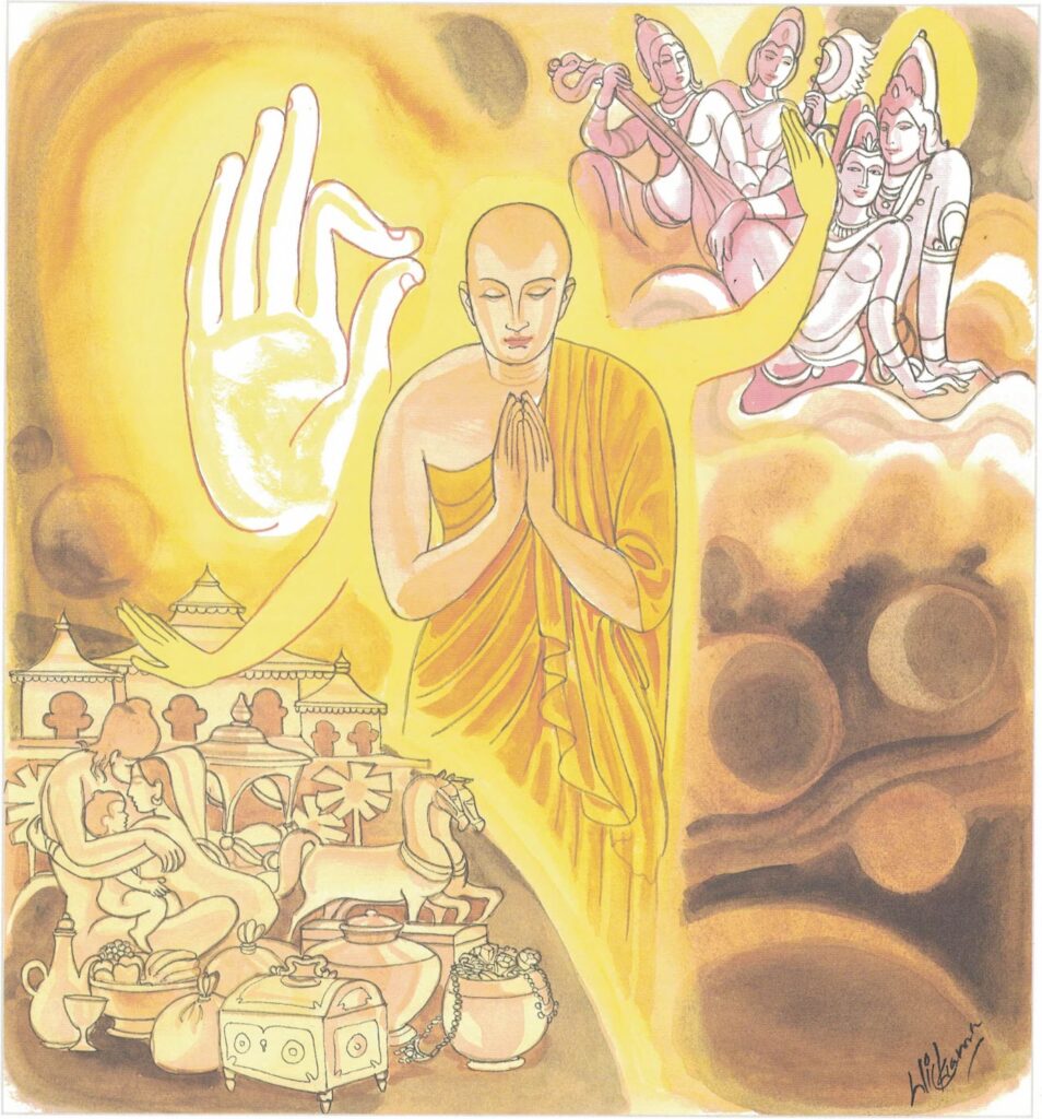 Here the term thirst includes not only desire for, and attachment to, sense-pleasures, wealth and power, but also desire for, and attachment to, ideas and ideals, views, opinions, theories, conceptions and beliefs (dhamma-taṇhā). According to the Buddha’s analysis, all the troubles and strife in the world, from little personal quarrels in families to great wars between nations and countries, arise out of this selfish thirst. From this point of view, all economic, political and social problems are rooted in this selfish thirst. Great statesmen who try to settle international disputes and talk of war and peace only in economic and political terms touch the superficialities, and never go deep into the real root of the problem. As the Buddha told Raṭṭhapāla: The world lacks and hankers, and is enslaved to thirst (taṇhādāso).