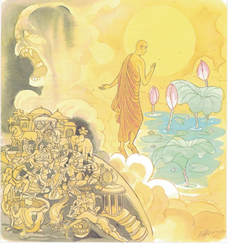 Pali text, illustration and English translation of Dhammapada verse 413: