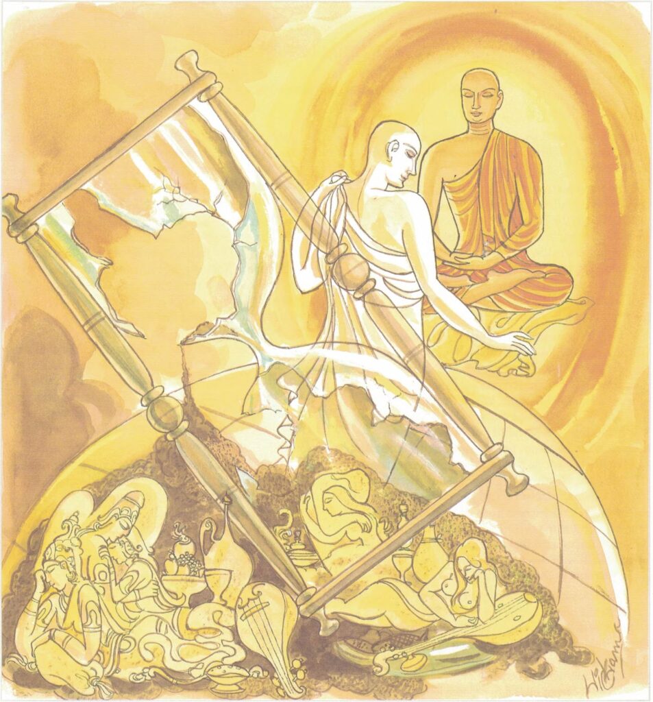 It is said that a certain mime, giving performances from place to place, heard the Buddha preach the Dhamma, whereupon he retired from the world, became a monk, and attained arahatship. One day, as he was entering the village for alms, in company with the congregation of monks presided over by the Buddha, the monks saw a certain mime going through his performance. Thereupon they asked the monk who was once a mime, “Brother, yonder mime is going through the same kind of performance you used to go through; have you no longing for this sort of life?” “No, brethren,” replied the monk. The monks said to the Buddha, “Venerable, this monk utters what is not true, is guilty of falsehood.” When the Buddha heard them say this, He replied, “Monks, my son has passed beyond all bonds.”