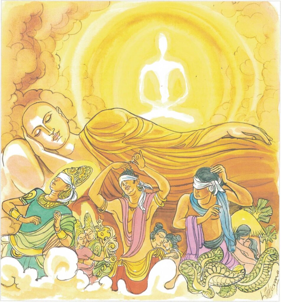 The Buddha, knowing that they were on their way, procured and placed in a row five skulls, one each of men who had been reborn in the four states of existence: hell, the animal world, the world of men, and the world of the deities; and one skull belonging to a man who had attained arahatship. When they arrived, He asked Vangīsa, “Are you the man of whom it is said that by rapping on the skulls of dead men you can tell in which of the states of existence they have been reborn?” “Yes,” said Vangīsa. “Then whose is this skull?” Vangīsa rapped on the skull and said, “This is the skull of a man who has been reborn in Hell.” “Good! good!” exclaimed the Buddha, applauding him. Then the Buddha asked him about the next three skulls, and Vangīsa answered without making a mistake. The Buddha applauded him for each answer he gave and finally showed him the fifth skull. “Whose skull is this?” he asked. Vangīsa rapped on the fifth skull as he had on the others, but confessed that he did not know in which of the states of existence the man had been reborn.
