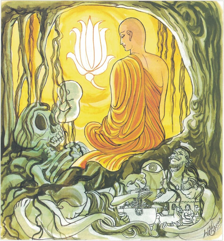 For one day, while she was living in the world, her husband Visākhā, a lay disciple, heard the Buddha preach the Dhamma and attained the fruit of the third path. Thereupon he thought to himself, “I must now turn over all of my property to Dhammadinnā.” Now it had previously been his custom on returning home, in case he saw Dhammadinnā looking out of the window, to smile pleasantly at her. But on this particular day, although she was standing at the window, he passed by without so much as looking at her. “What can this mean?” thought she. “Never mind, when it is mealtime, I shall find out.” So when meal-time came, she offered him the usual portion of boiled rice. Now on previous days it had been his custom to say, “Come, let us eat together.” But on this particular day he ate in silence, uttering not a word. “He must be angry about something,” thought Dhammadinnā. After the meal Visākhā settled himself in a comfortable place, and summoning Dhammadinnā to his side, said to her, “Dhammadinnā, all the wealth that is in this house is yours. Take it!” Thought Dhammadinnā, “Persons who are angry do not offer their property and say, ‘Take it!’ What can this mean?” After a time, however, she said to her husband, “But, husband, what about you?” “From this day forth, I shall engage no more in worldly affairs.” ‘Who will accept the saliva you have rejected? In that case permit me also to become a nun.” “Very well, dear wife,” replied Visākhā, giving her the desired permission. And with rich offerings he escorted her to the nuns’ convent and had her admitted to the Sangha. After she had made her full profession she was known as the nun Dhammadinnā. Dhammadinnā yearned for the life of solitude and so accompanied the nuns to the country. Residing there, in no long time she attained arahatship together with the supernatural faculties. Thereupon she thought to herself, “Now, by reason of me, my kinsfolk will perform works of merit.” Accordingly she returned once more to Rājagaha. When the lay disciple Visākhā heard that she had returned, he thought to himself, ‘What can be her reason for returning?” And going to the nuns’ convent and seeing the nun, his former wife, he saluted her and seated himself respectfully on one side. Thought he, “It would be highly improper for me to say to her, ‘noble sister, pray are you discontented?’ I will therefore ask her this question.” So he asked her a question about the path of conversion, and she immediately answered it correctly. Continuing this line of questioning, the lay disciple asked about the remaining paths also. He did not stop, however, at this point, but continuing his questions, asked her about arahatship. ‘Wonderful, brother Visākhā!” exclaimed Dhammadinnā. “But if you desire to know about arahatship, you should approach the Buddha and ask him this question.” Visākhā saluted the nun his former wife, and rising from his seat and going to the Buddha, told the Buddha about their talk and conversation. Said the Buddha, “What my daughter Dhammadinnā said was well said. In answering this question I also should answer it as follows.” Then he gave the stanza.