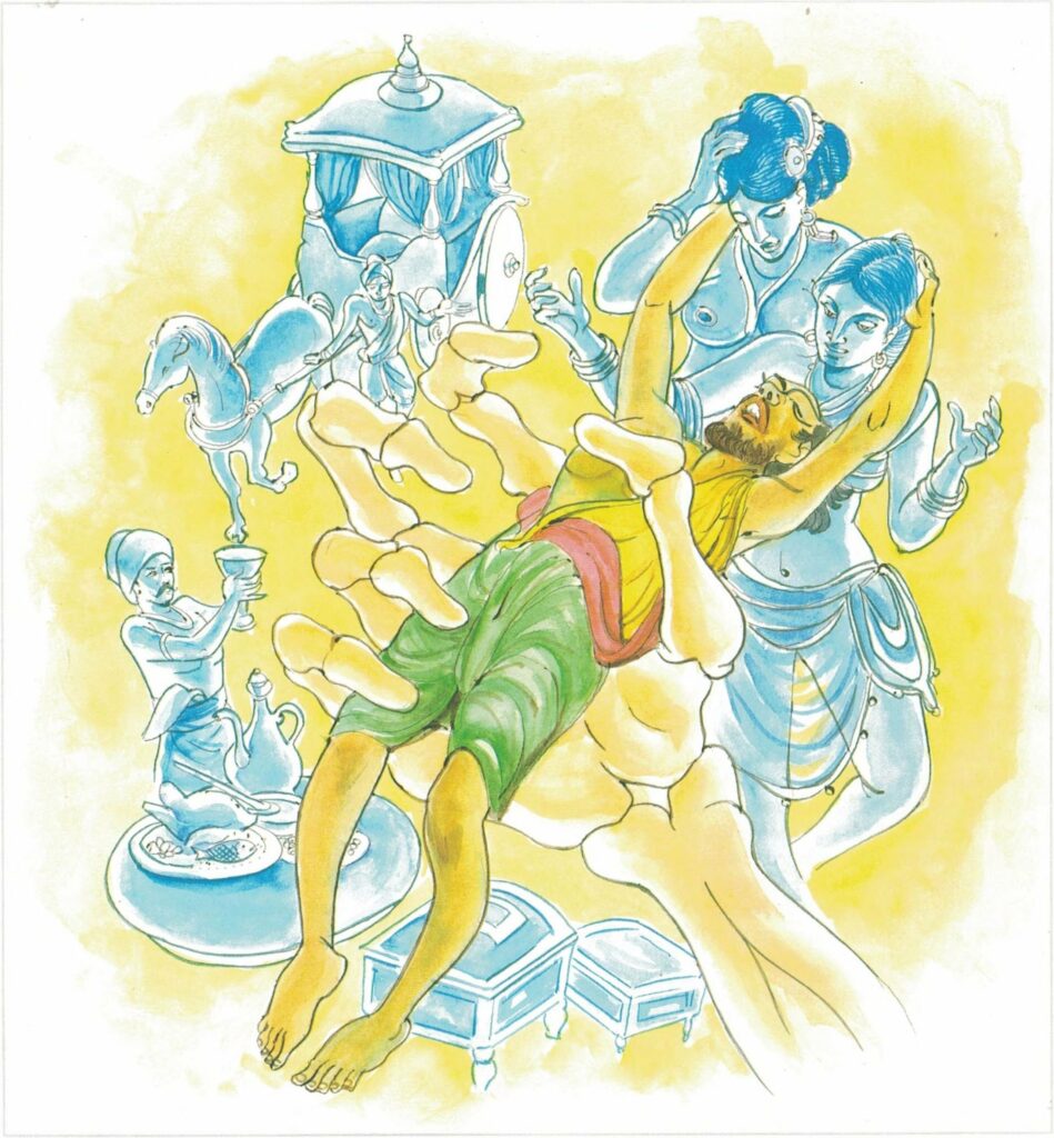 Those who pursue worldly pleasures are like garland-makers who pick flowers here and there in the garden according to their preference. Those given to pleasures of the senses are not satisfied. They seek still more. In consequence of their endless pleasure-seeking they come under the spell of Antaka, or ‘ender of all’, i.e. death.