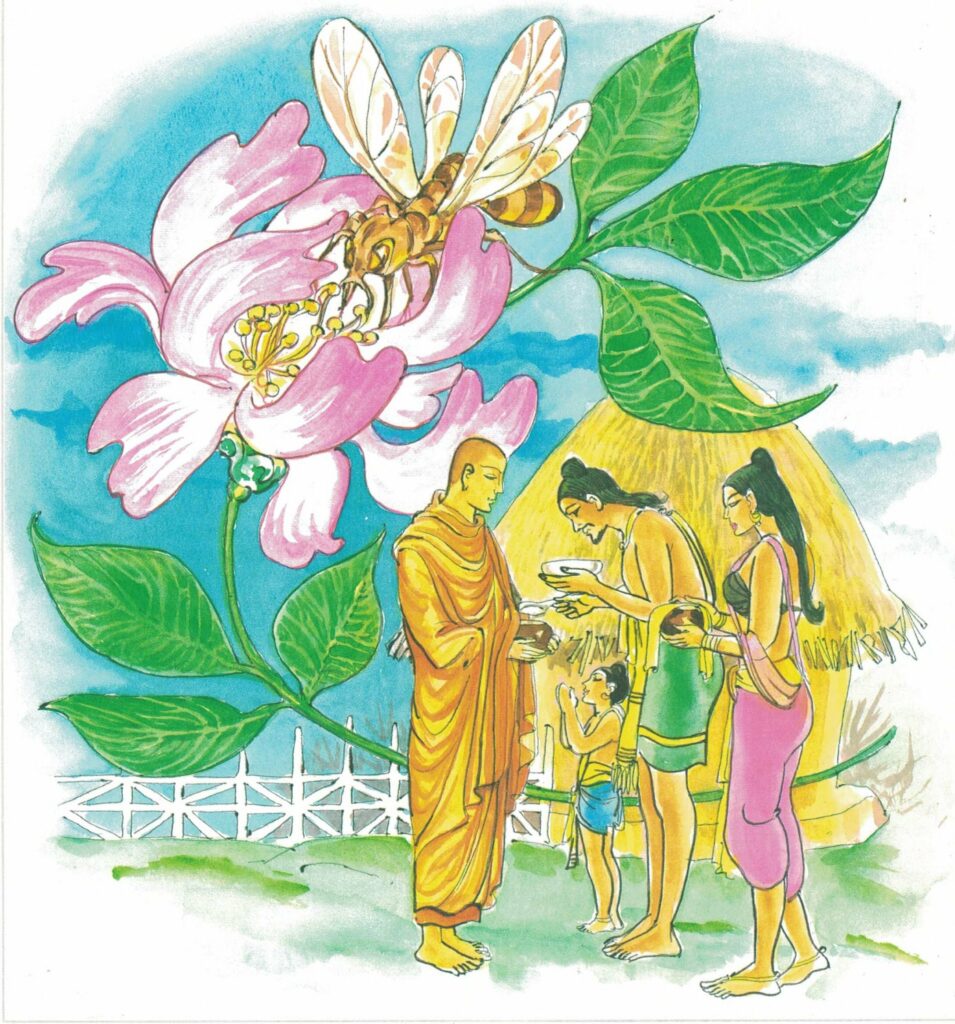 The bee extracts honey from flowers without damaging either the colour or the fragrance of the flower and in so doing helps the tree bear much fruit. Similarly, the silent sage goes about in the village collecting alms without harming anyone even minutely, and in so doing helps people gain much merit and happiness.