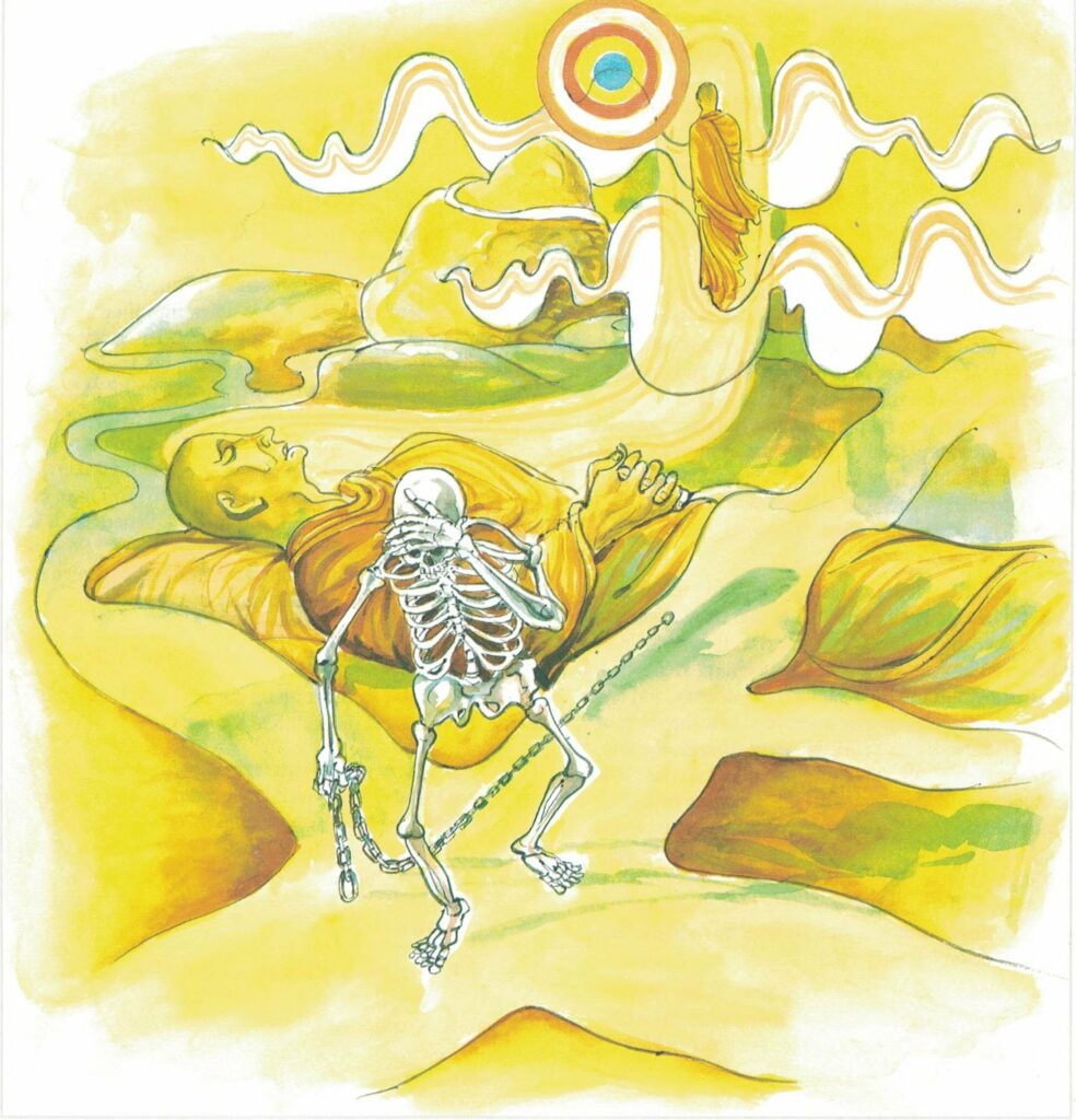 Accordingly, he took the razor with which he shaved his hair, and lay down on his bed, intending to end his life. Māra perceived his intention and thought to himself, “This monk intends to use the razor. Those who use the razor in this way are indifferent to life. Such men, having attained penetration, win Arahatship. But if I try to prevent him from carrying out his intention, he will pay no attention to my words. I will therefore induce the Buddha to prevent him.” At that moment the Venerable drew his knife. The Buddha, perceiving Māra, said, “Thus do those who are steadfast, nor do they yearn for life. Godhika has uprooted craving and has attained Nibbāna.” Now the Buddha, accompanied by a large number of monks, entered the place where the Venerable had lain down and used his knife. At that moment Māra, the Evil One, like a pillar of smoke or a mass of darkness, was searching in all directions for the Venerable’s consciousness. Thought he, “Where has his rebirth-consciousness fixed itself?” The Buddha pointed out to the monks the pillar of smoke and the mass of darkness and said to them, “Monks, that is Māra, the Evil One, searching for the consciousness of the goodly youth Godhika. Thinks he, ‘Where has the consciousness of the goodly youth Godhika fixed itself?’ But, monks, the consciousness of the goodly youth Godhika has not fixed itself. For, monks, the goodly youth Godhika has passed into Nibbāna. Māra, being unable to find the place where the consciousness of the Venerable had fixed itself, approached the Buddha and asked him, “Where has Godhika gone?”