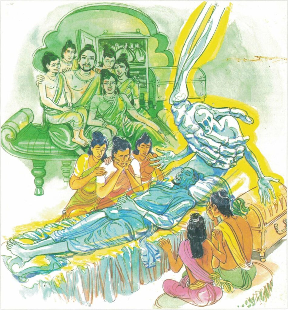 There was once a very wealthy man named Ānanda in Sāvatthi. Although he possessed eighty billion, he was very reluctant to give anything in charity. To his son, Mūlasiri, he used to say, “Don’t think the wealth we have now is very much. Do not give away anything from what you have, for you must make it grow. Otherwise, your wealth will dwindle.” This rich man had five pots of gold buried in his house and he died without revealing their location to his son.