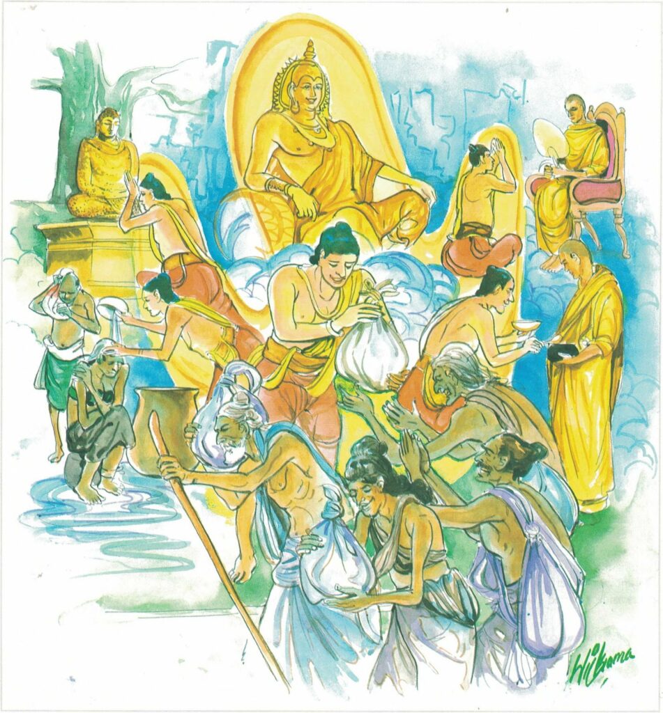 The king accompanied the Buddha a little way and turned back. Then he sent for the florist and asked him, “What did you say when you honoured the Buddha?” The florist replied, “Your majesty, I surrendered my life to him and honoured him, saying, ‘The king may kill me or banish me from his kingdom.’” The king said, “You are a great man.” So saying, he presented him with eight elephants, eight horses, eight male slaves, eight female slaves, eight magnificent sets of jewels, eight thousand pieces of money, eight women taken from the royal harem, adorned with all the adornments, and eight choice villages. These eight-fold gifts did the king give him.