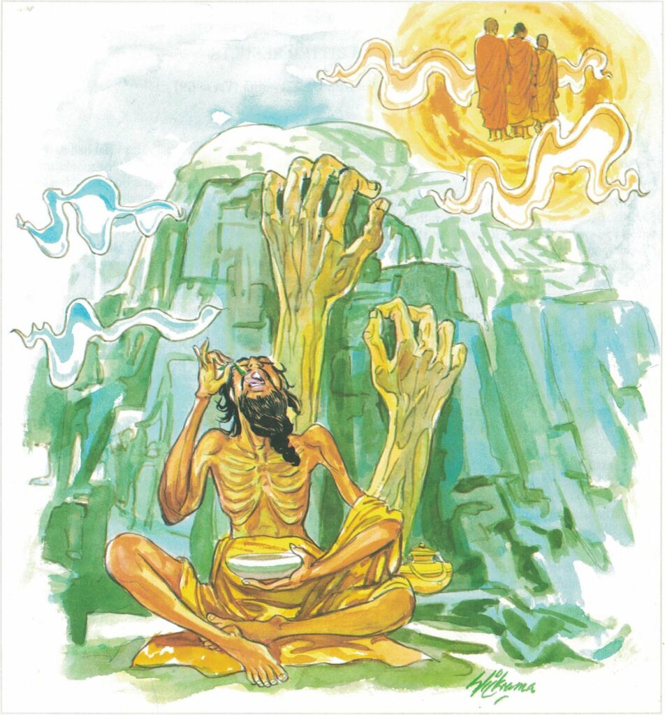 Many people believed him and some would come to him with offerings of choice food. Then Jambuka would refuse and say, “I do not take any food except air.” When pressed, he would take just a little of the food with the tip of a blade of grass and say, “Now go, this little food will give you enough merit.” In this way, Jambuka lived for fifty-five years, naked and taking only excreta.