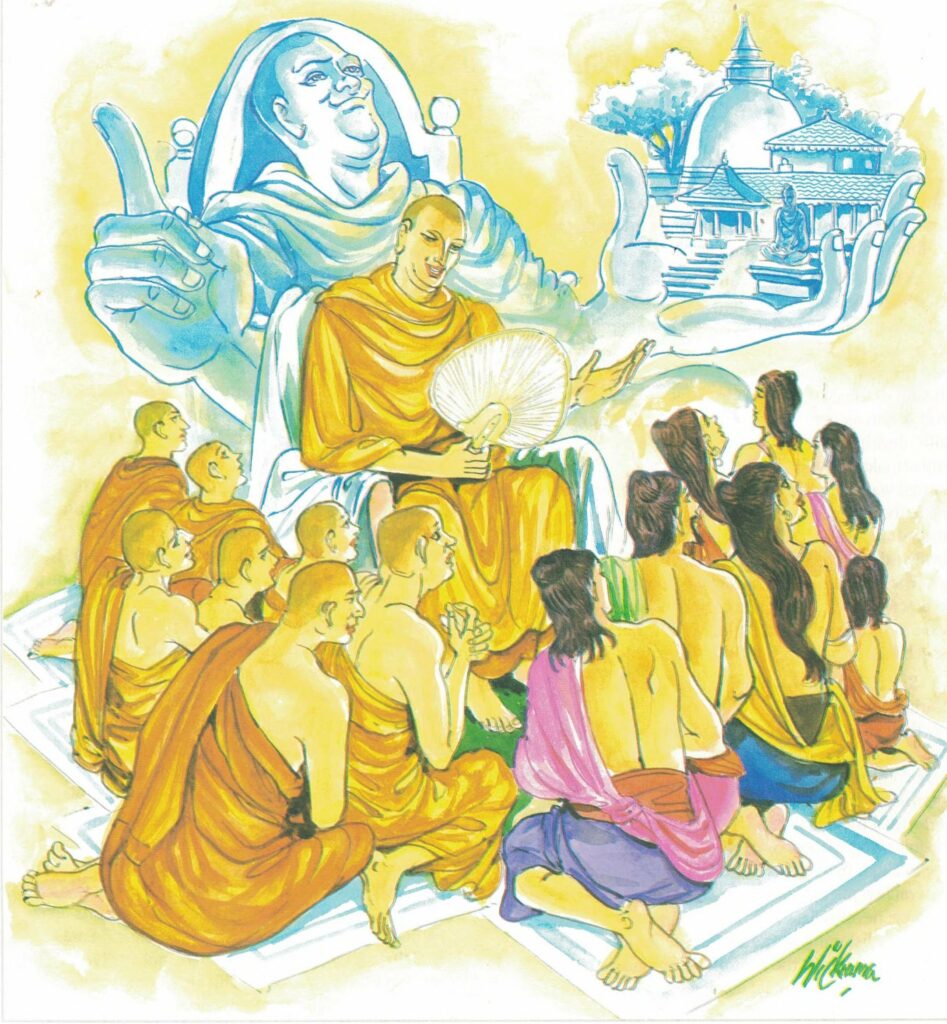Some time afterwards, the two Chief Disciples, hearing the rumour of Citta’s good qualities, decided to pay their respects to him and therefore went to Macchikāsaṇḍa. Citta the householder, hearing that they were coming, proceeded forth half a league to meet them, escorted them to the monastery, invited them, performed the usual duties for visitors, and then made the following request of the Buddha, “Venerable, we desire to listen to a short discourse on the Dhamma.” The Venerable replied, “Lay disciple, we are weary with the journey;nevertheless listen for a short while.” Citta, merely by listening to the Buddha’s discourse on the Dhamma, obtained the fruit of the second path. Then he bowed to the two chief disciples and invited them to be his guests, saying, “Venerables, pray take a meal in my house tomorrow with your thousand monks.” Then he turned to the resident monk, the Venerable Sudhamma, and invited him, saying to him, “Venerable, you also come tomorrow with the Venerables.” Angry at the thought, “He invited me last,” Sudhamma refused the invitation; and although Citta repeated the invitation again and again, he still refused. The lay disciple said, “Pray be present, Venerable,” and went out. On the following day he prepared splendid offerings in his own residence. Very early in the morning the Venerable Sudhamma thought to himself, ‘What manner of food has the householder prepared for the chief disciples? I will go see.” So very early in the morning he took bowl and robe and went to his house.