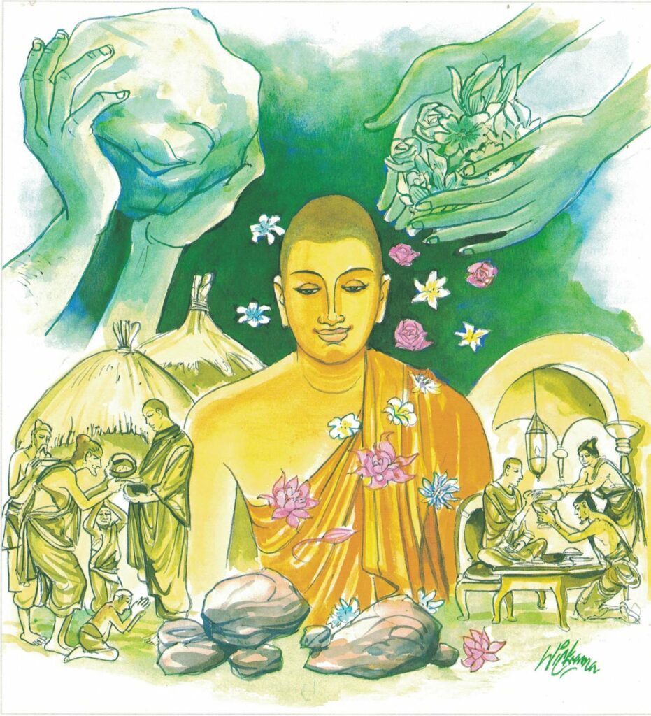 At the request of a Brāhmin from Verañjā, the Buddha was, on one occasions, staying at Verañjā with a group of monks. While they were at Verañjā, the brāhmin failed to look after them. The people of Verañjā, who were then facing a famine, could offer very little to the monks when they went on their alms-round. In spite of all these hardships, the monks were not disheartened; they were quite contented with the small amount of shrivelled grain which the horse-traders offered them daily. At the end of the vassa (rainy season), after informing the brāhmin from Verañjā, the Buddha returned to the Jetavana Monastery, accompanied by the monks. The people of Sāvatthi welcomed them back with choice food of all kinds.
