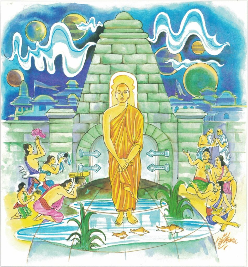 As the Venerable recited his own virtues, remorse pervaded the whole body of the monk who had unjustly slandered him. And straightaway he fell at the feet of the Buddha, admitted that he was guilty of slander, and confessed his fault. The Buddha addressing the Venerable, said, “Sāriputta, pardon this deluded man, lest his head split into seven pieces.” Thereupon the Venerable crouched before the monk, and extending his clasped hands in an attitude of reverence, said to him, “Venerable, I freely pardon this venerable monk. Let this venerable monk also pardon me if I have in any way offended against him.” Thereupon the monks said, “Behold, brethren, the surpassing goodness of the Venerable! He cherishes neither anger nor hatred against this lying, slanderous monk. Instead, he crouches before him, extends his hands in an attitude of reverence, and asks his pardon.” When the Buddha heard the talk of the monks, he said, “Monks, what are you talking about?” When they told him, he said, “Monks, it is impossible for Sāriputta and his like to cherish anger or hatred. Sāriputta’s mind is like the great earth, like a threshold, like a pool of still water.”