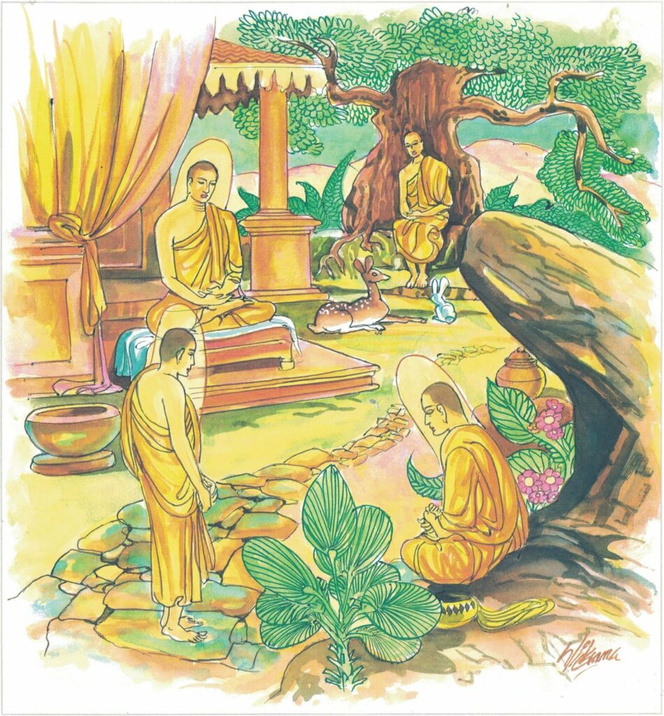 Monk Revata took a meditation topic from those monks and left for an acacia forest, thirty yojanas (leagues) away from the monastery. At the end of the vassa (rainy season), the novice monk attained arahatship. Venerable Sāriputta then asked permission from the Buddha to visit his brother, but the Buddha replied that he himself would go there. So the Buddha accompanied by Venerable Sāriputta, Venerable Sīvalī and many other monks set out to visit Sāmanera (novice) Revata.
