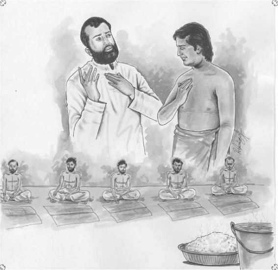 ‘The anniversary was being celebrated. Hungry men and woman in hundreds were sitting on the main road in front of the Ashrama, with leaf plates before them. The kitchuri had not been brought down yet. It was being offered before the Master’s portrait. The Master became impatient and said in my ears: “Look, they are sitting there with their leaf plates, eagerly waiting to be served. It is through their mouths that I shall eat. Serve the food to me on their plates.” As I heard this, I told the people to make haste. The serving began, and the people started to eat at once.’