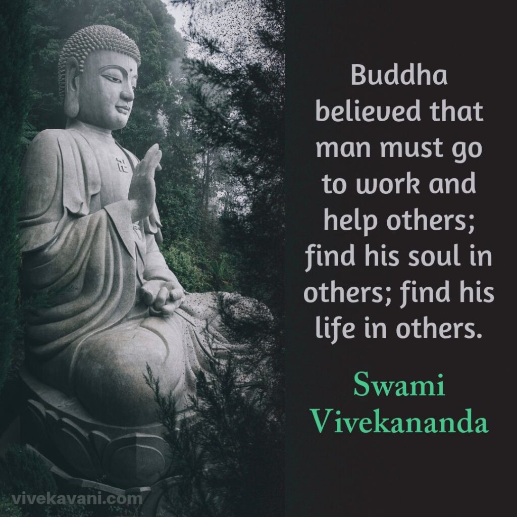 “Buddha found in India too much talking about God and His essence and too little work. He always insisted upon this fundamental truth, that we are to be pure and holy, and that we are to help others to be holy also. He believed that man must go to work and help others; find his soul in others; find his life in others. He believed that in the conjunction of doing good to others is the only good we do ourselves. [sic] He believed that there was always in the world too much theory and too little practice. A dozen Buddhas in India at the present time would do good, and one Buddha in this country would also be beneficial.