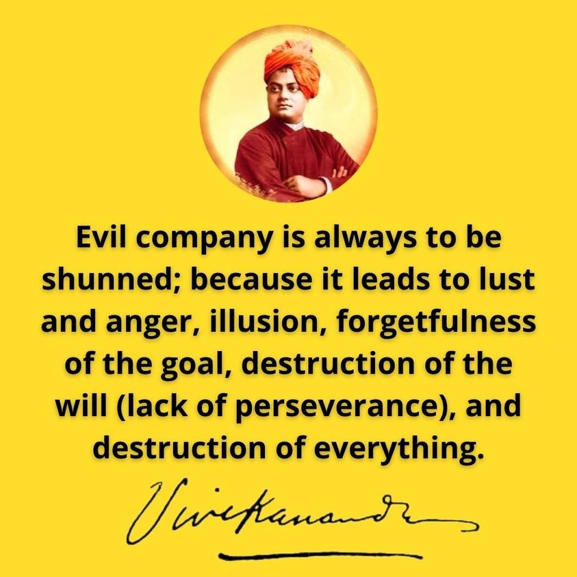 - Evil company is always to be shunned; because it leads to lust and anger, illusion, forgetfulness of the goal, destruction of the will (lack of perseverance), and destruction of everything. (Narada Bhakti Sutra)[Source]