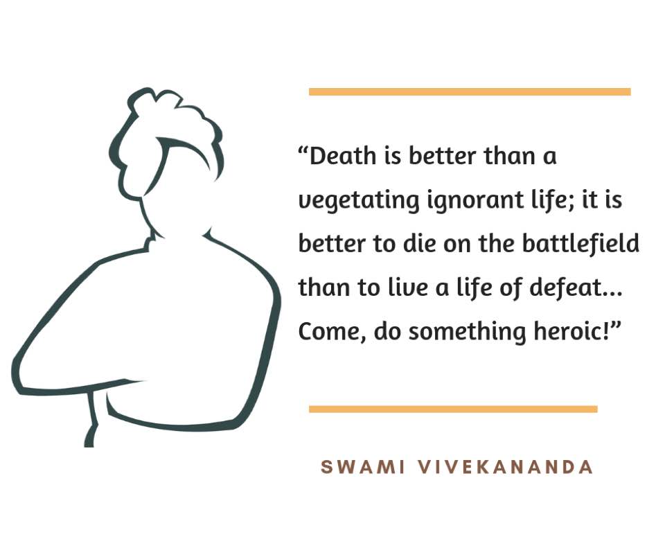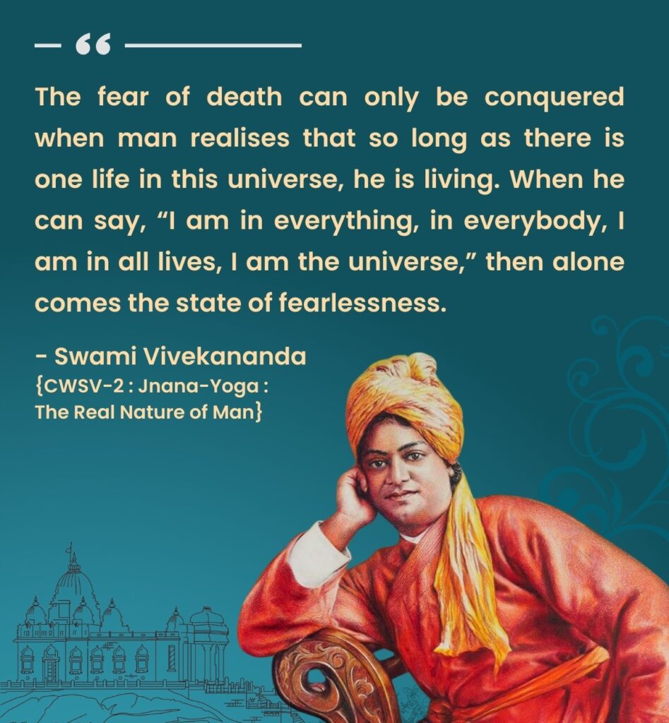 - The fear of death can only be conquered when man realises that so long as there is one life in this universe, he is living. When he can say, “I am in everything, in everybody, I am in all lives, I am the universe,” then alone comes the state of fearlessness.[Source]