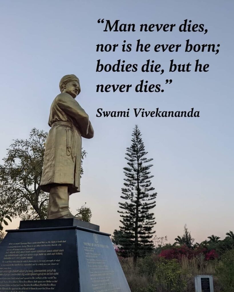The followers of Swami Vivekananda celebrate his birth anniversary (12 January), but (generally) don’t organize (mourning) event on his death anniversary (4 July), as they believe in Bhagavad Gita’s dictum— “Death means only a change of garment.”[Source] Some followers and devotees of Ramakrishna do not use the word “death” or “died”, they say “samadhi” or “mahasamadhi“. British novelist Christopher Isherwood visited Belur Math and felt— “In the life of the Belur Math, Vivekananda still lives and is as much a participant in its daily activities as any of its monks.”[Source]