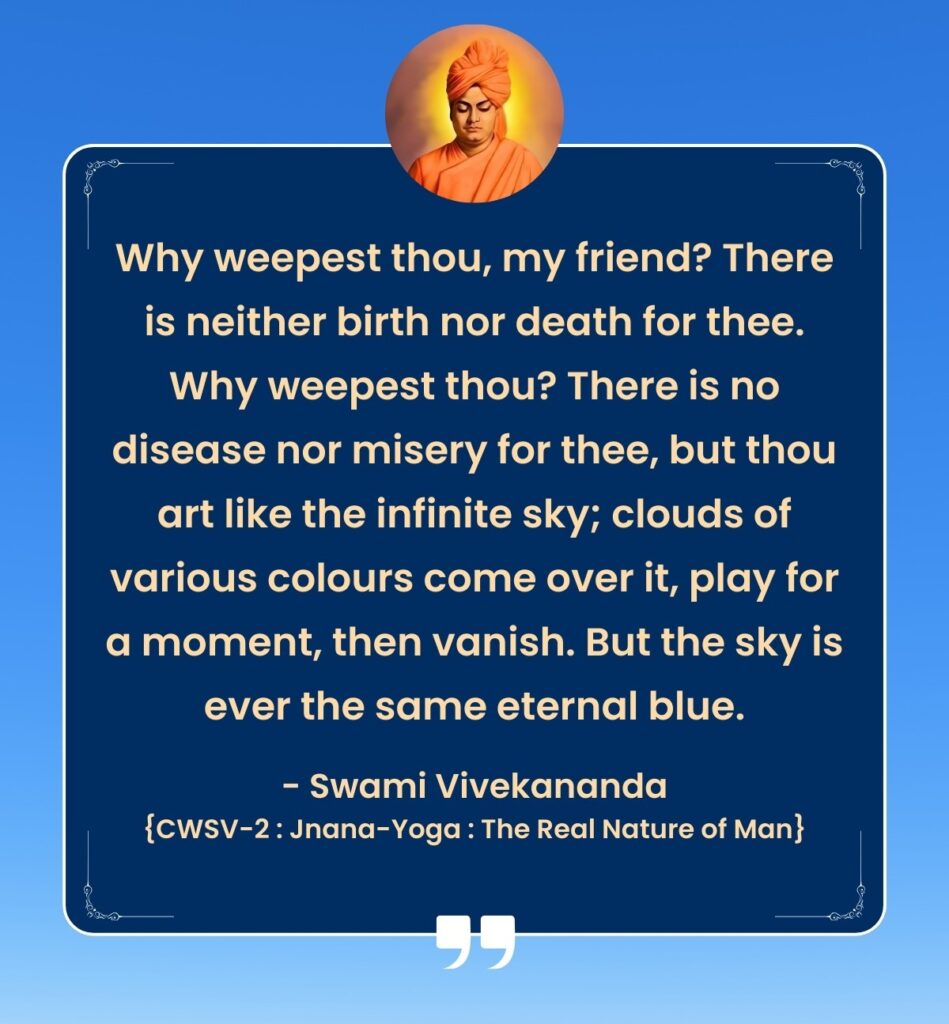 - Why weepest thou, my friend? There is neither birth nor death for thee. Why weepest thou? There is no disease nor misery for thee, but thou art like the infinite sky; clouds of various colours come over it, play for a moment, then vanish. But the sky is ever the same eternal blue.[Source]