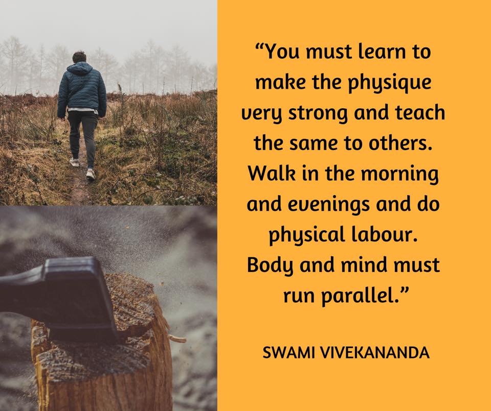 - You must learn to make the physique very strong and teach the same to others. Don’t you find me exercising every day with dumb – bells even now? Walk in the morning and evenings and do physical labour. Body and mind must run parallel. It won’t do to depend on others in everything. When the necessity of strengthening the physique is brought home to people, they will exert themselves of their own accord. It is to make them feel this need that education is necessary at the present moment.[Source]