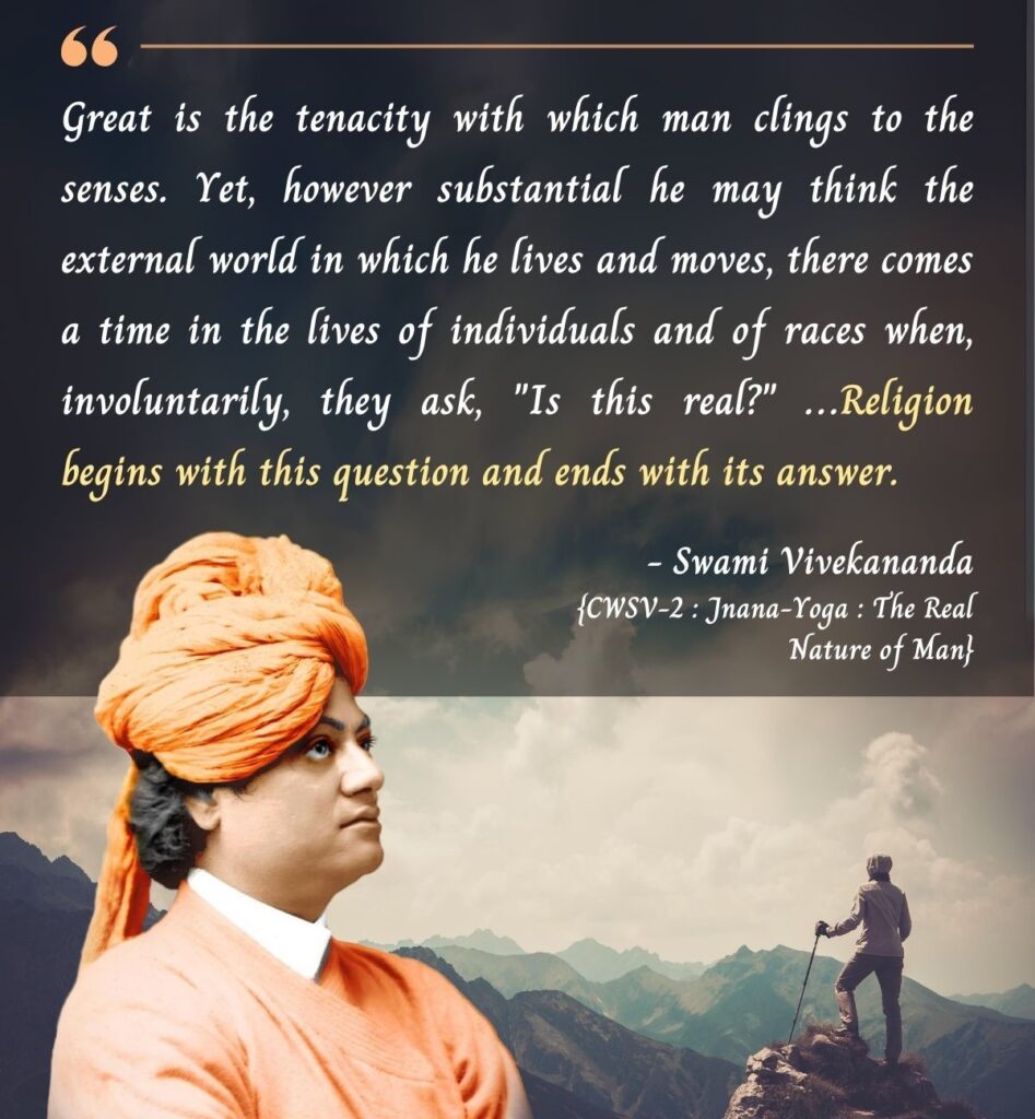 - Great is the tenacity with which man clings to the senses. Yet, however substantial he may think the external world in which he lives and moves, there comes a time in the lives of individuals and of races when, involuntarily, they ask, “Is this real?” To the person who never finds a moment to question the credentials of his senses, whose every moment is occupied with some sort of sense-enjoyment — even to him death comes, and he also is compelled to ask, “Is this real?” Religion begins with this question and ends with its answer.[Source]