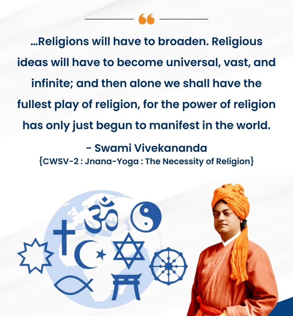 - Religions will have to broaden. Religious ideas will have to become universal, vast, and infinite; and then alone we shall have the fullest play of religion, for the power of religion has only just begun to manifest in the world.[Source]